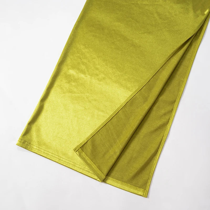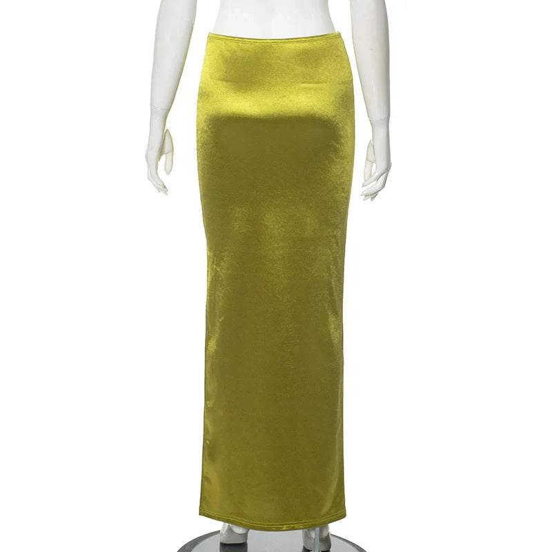 This A Love Like This Maxi Skirt offers a masterclass in considered dressing. This maxi skirt. cut on the bias from a stretch satin that drapes beautifully. features a side split to introduce movement and elongate the leg. The olive hue lends itself to versatile styling. pairing effortlessly with neutral tones or bolder color statements. Try it with cute accessories and a strappy top.