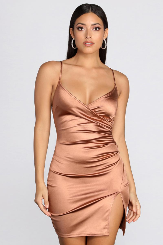 Mulberry satin spaghetti-strap dress featuring a faux-wrap front detail and a large slit up the leg. This fit of this dress is AMAZING! You'll get lots of compliments wearing this dress