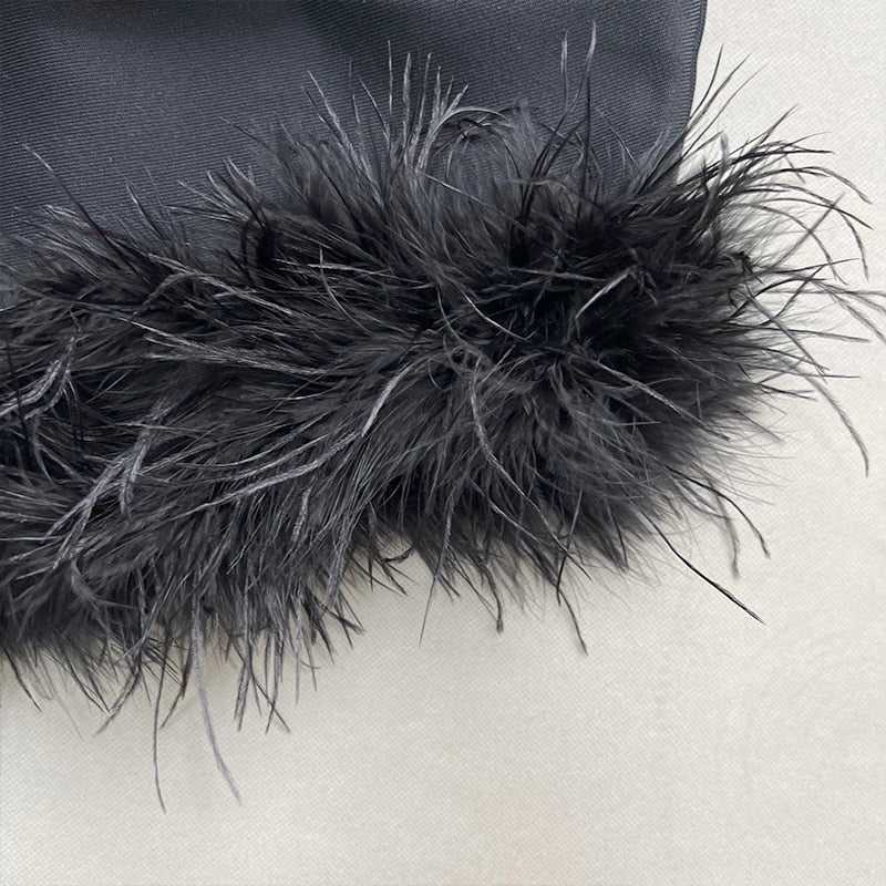 Please treat this dress gently since it's adorned with feathers; the occasional shedding of a single feather is to be expected.