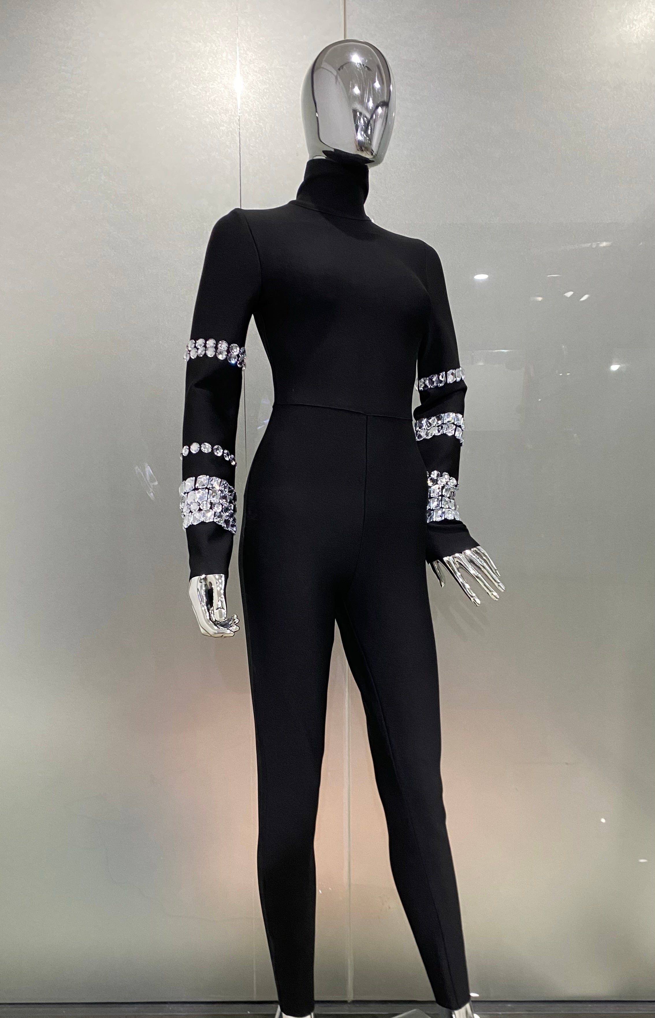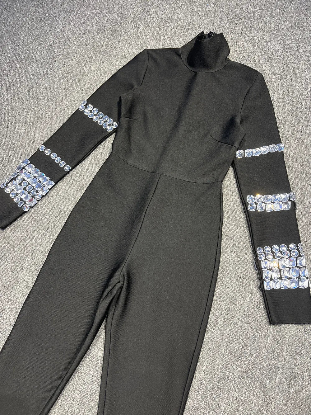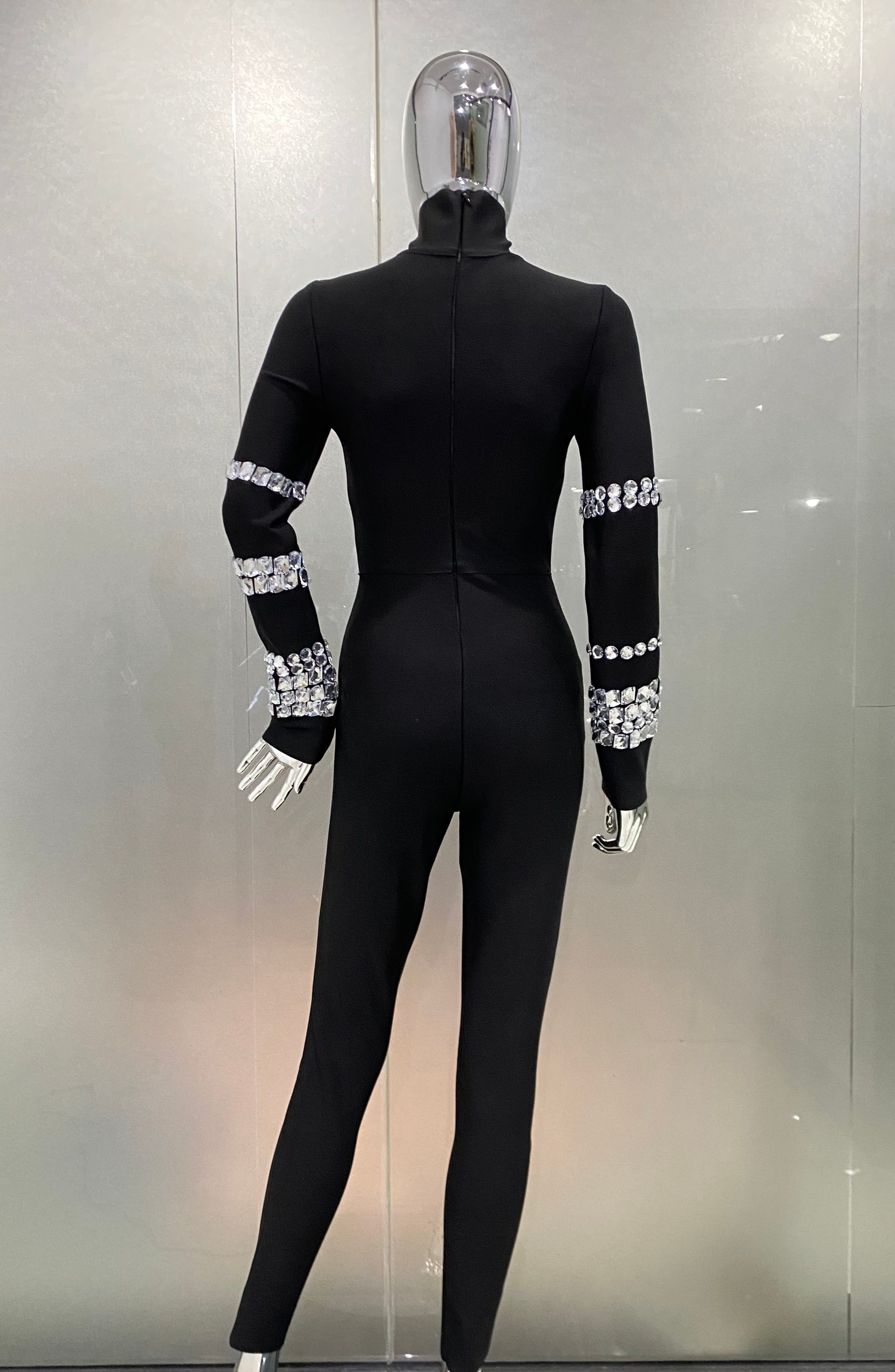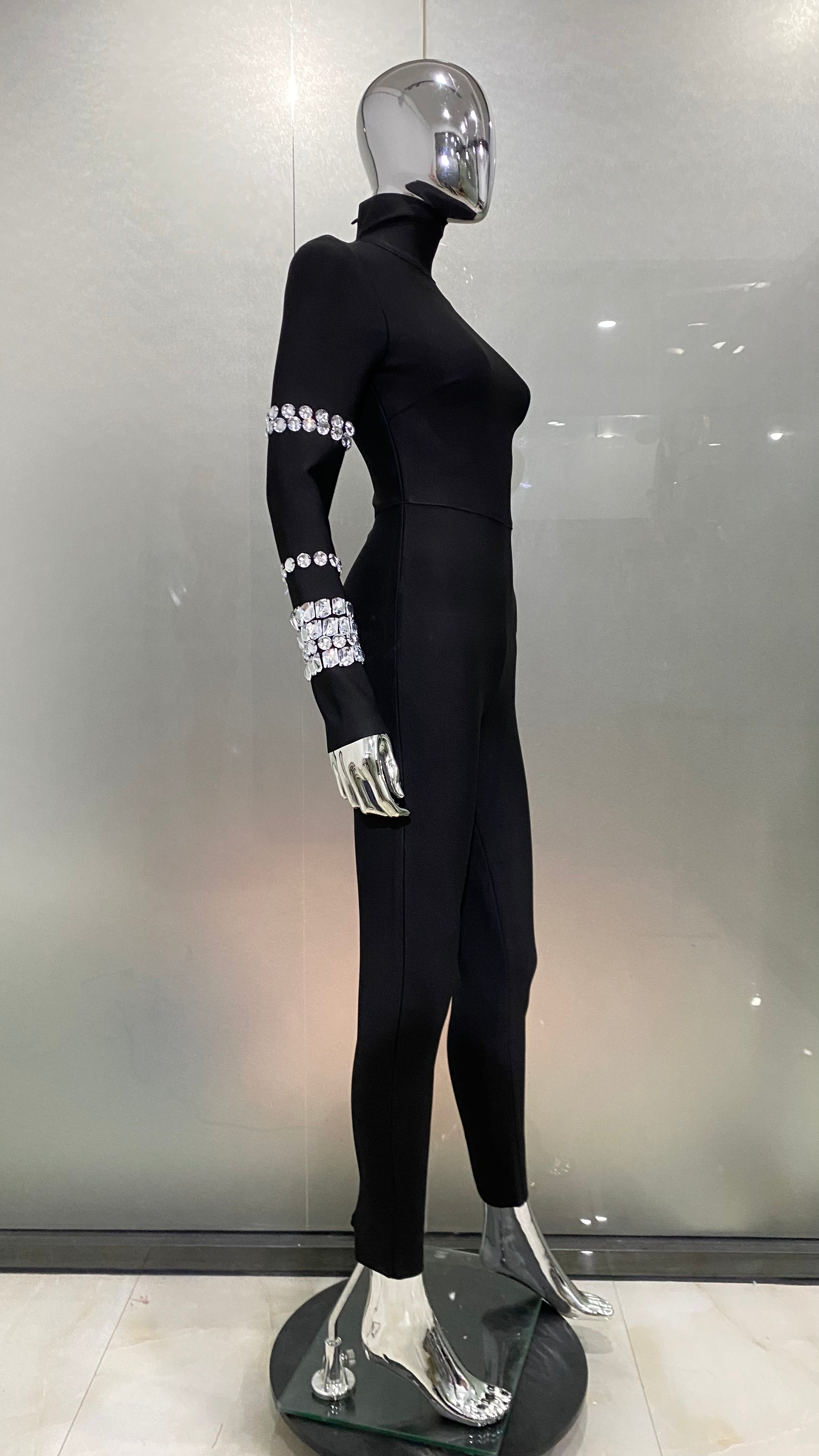 Indulge in pure luxury with our Abigail Bodycon Bandage Jumpsuit. This kim k inspired design exudes class and sophistication. making you stand out at any event. Adorned with shimmering crystals on the sleeves. elevate your style game and embrace the elegance of this exquisite piece.
