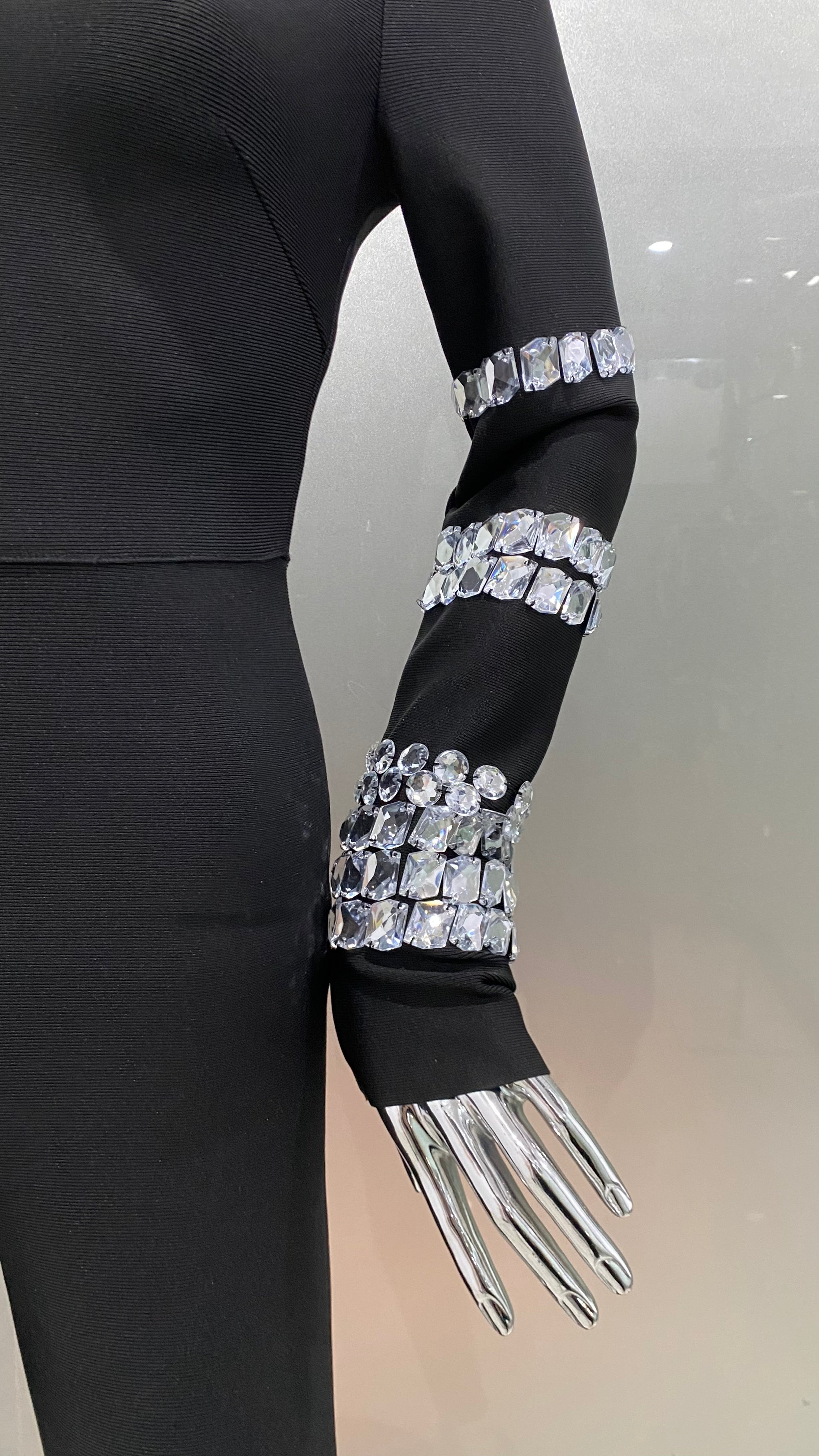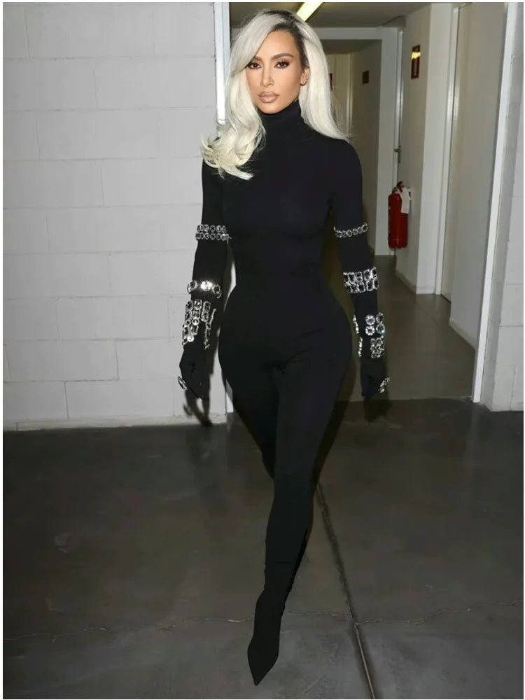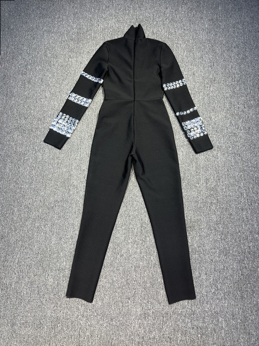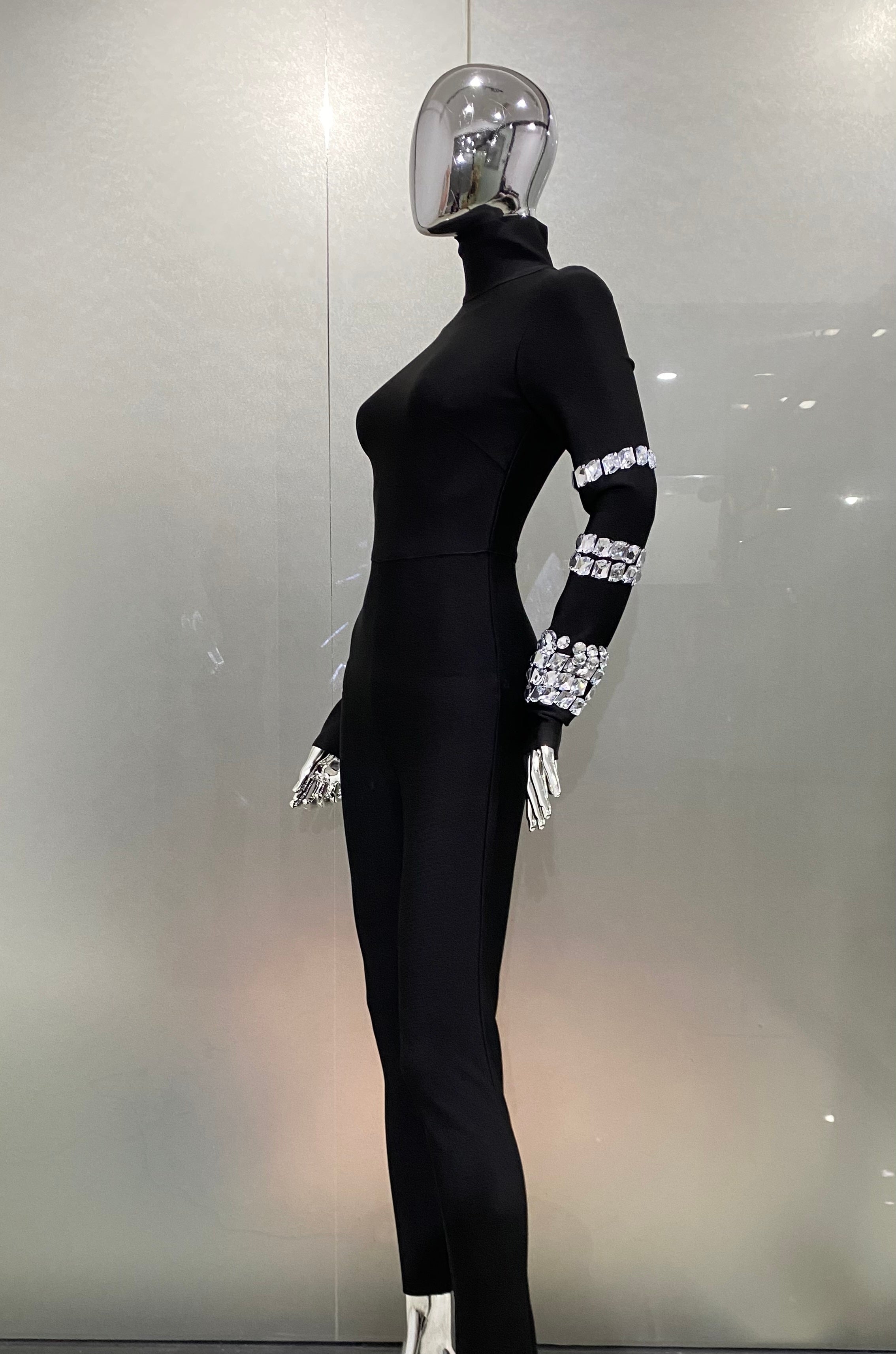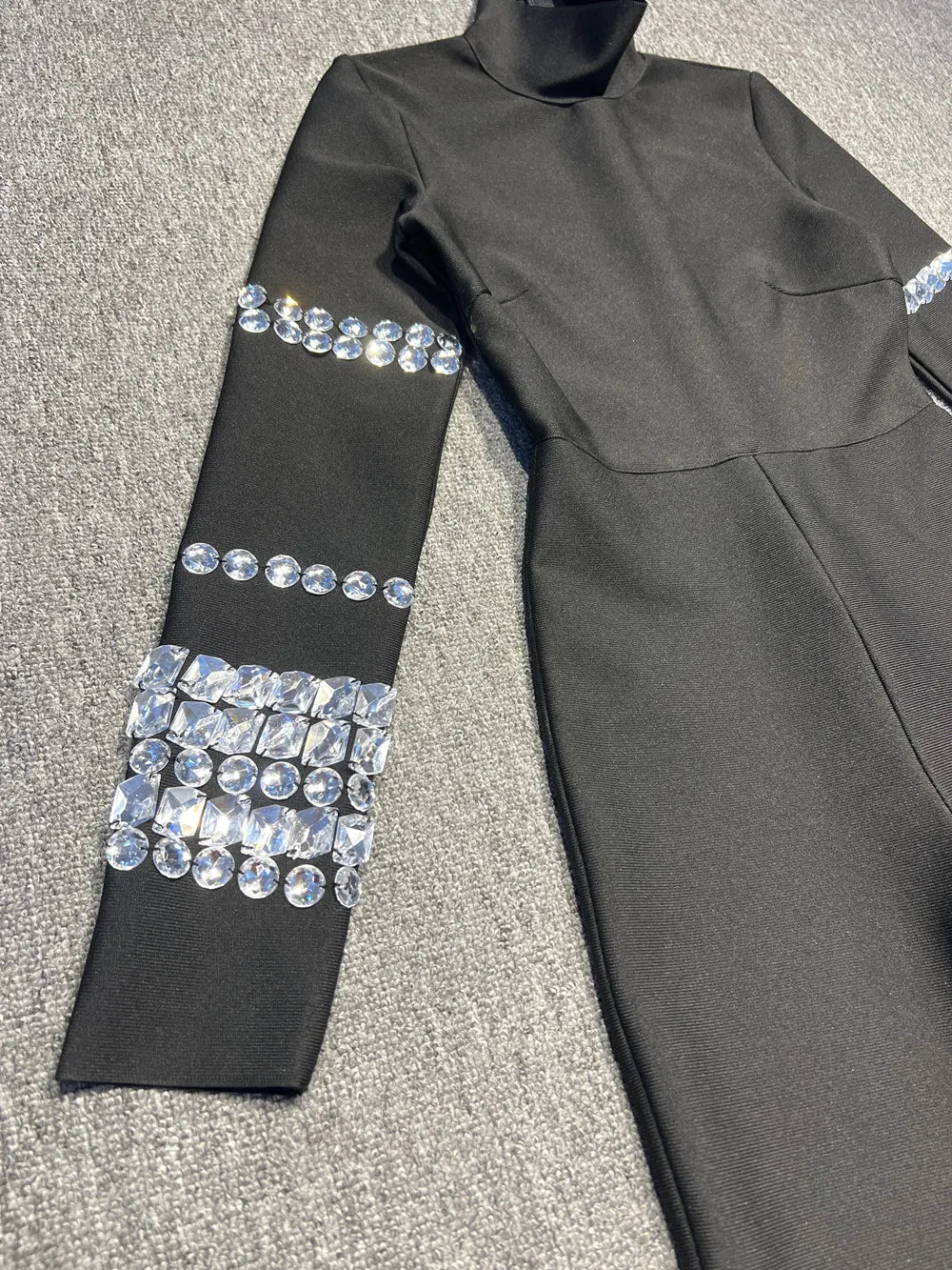 Indulge in pure luxury with our Abigail Bodycon Bandage Jumpsuit. This kim k inspired design exudes class and sophistication. making you stand out at any event. Adorned with shimmering crystals on the sleeves. elevate your style game and embrace the elegance of this exquisite piece.