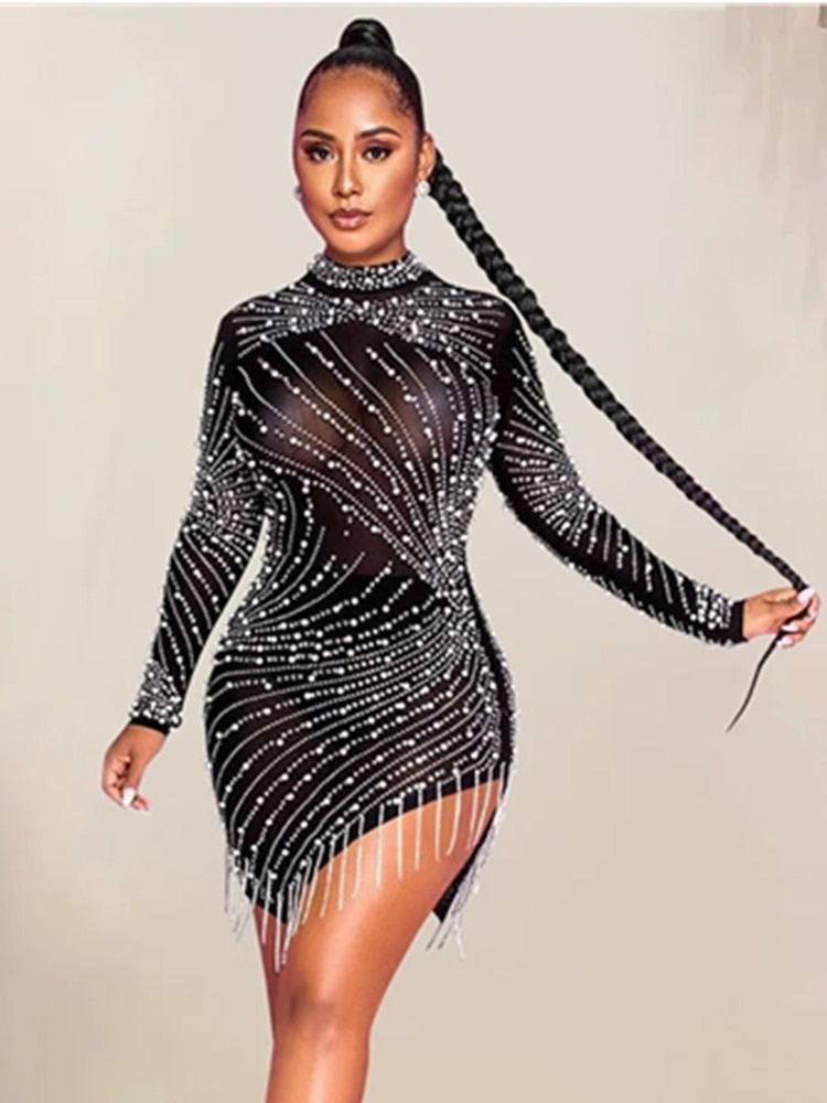 LuxuryTurtleneck Mesh Diamonds Crystal TasselStudded Beige Mini Dress