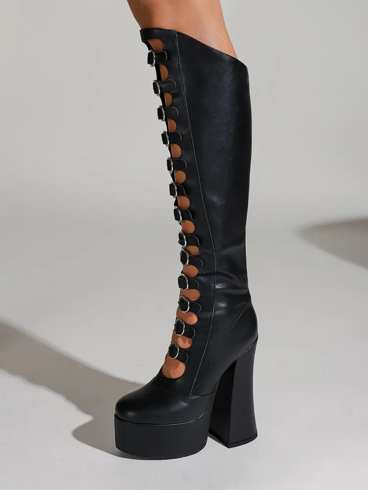 Your weekend heels are finally found with these Almighty Platform Knee High Boots. Featuring a PU material with an extreme platform design. block heel. strappy detailing and a knee-high length. we're in love.