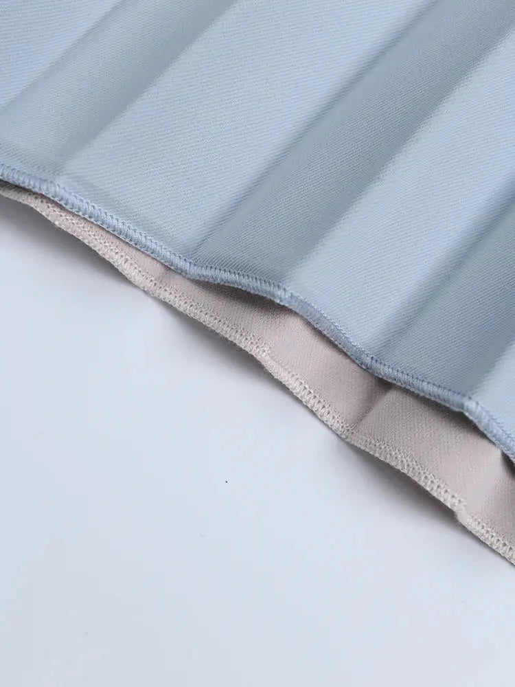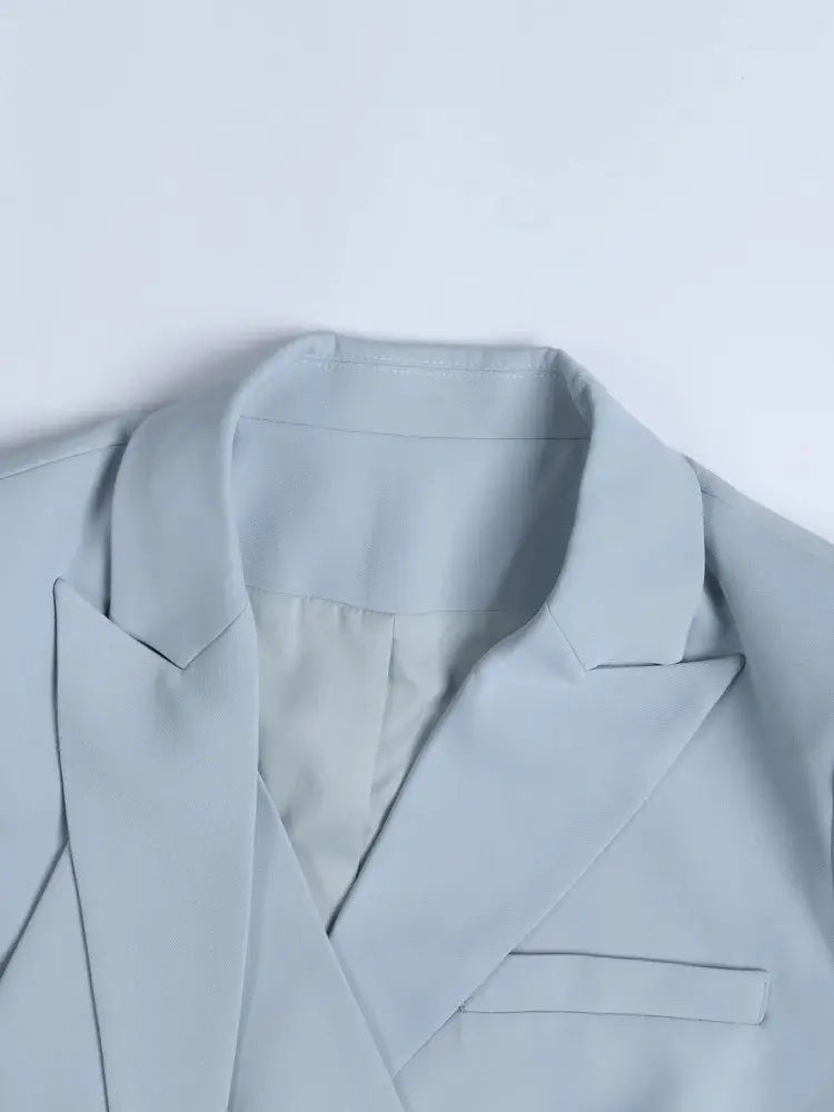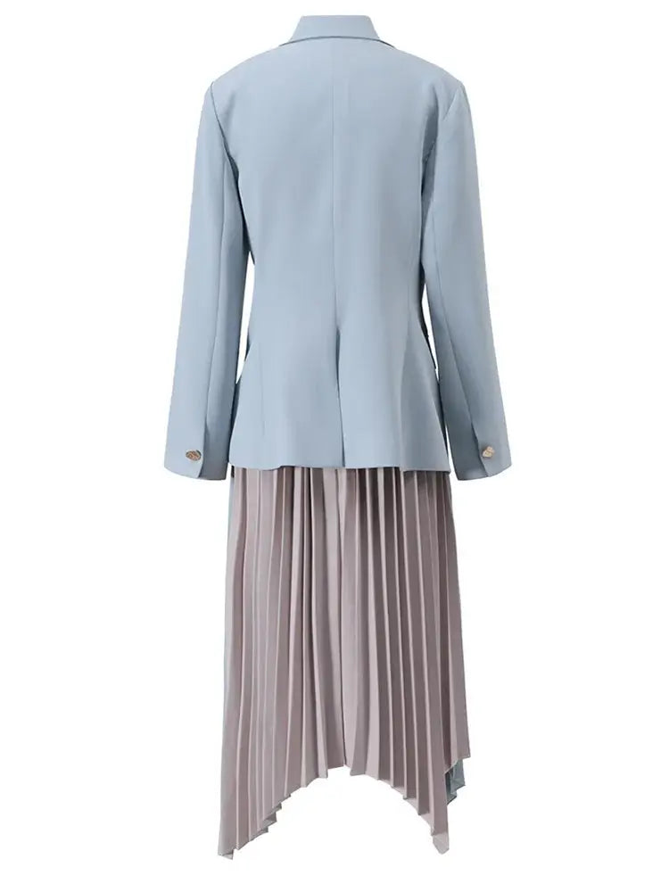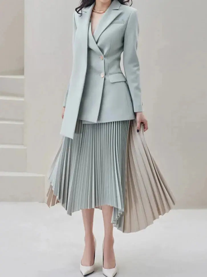 This high-quality blazer skirt set features a unique asymmetric contrast pleat design that exudes confidence and sophistication. Elevate your professional wardrobe and make a statement with this versatile and stylish set. Perfect for any occasion. you'll feel empowered and polished wearing this must-have ensemble.