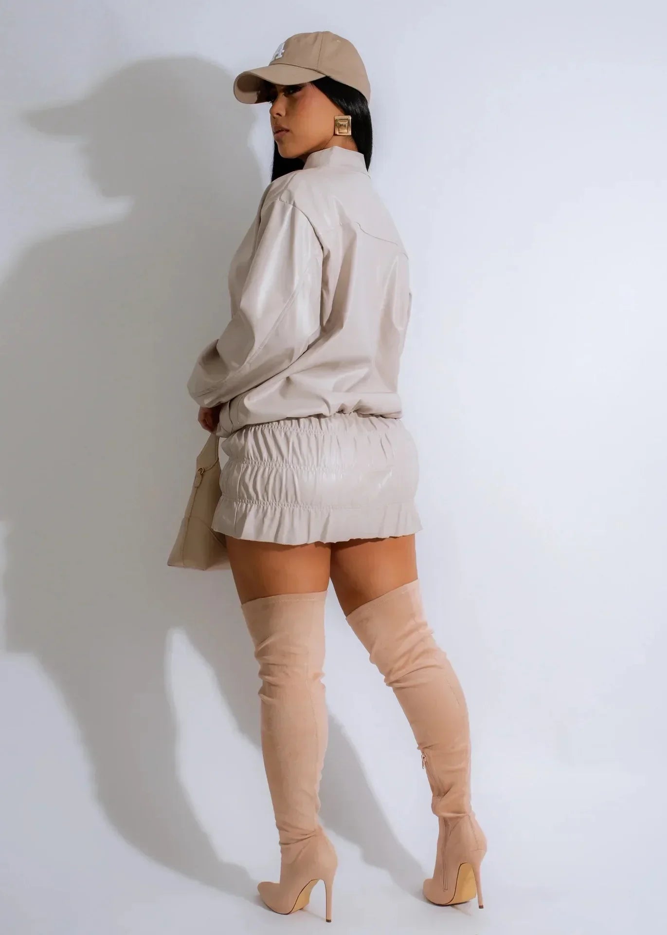 Bring all the faux leather feels to your weekend wardrobe with this Baddie Alert Leather Two Piece Skirt Set. Made from a faux leather material with a long sleeve zip up jacket and a mini skirt with ruched design. what's not to love? Style this two piece set with knee high boot heels and gold accessories for a look that won't ever go unnoticed!