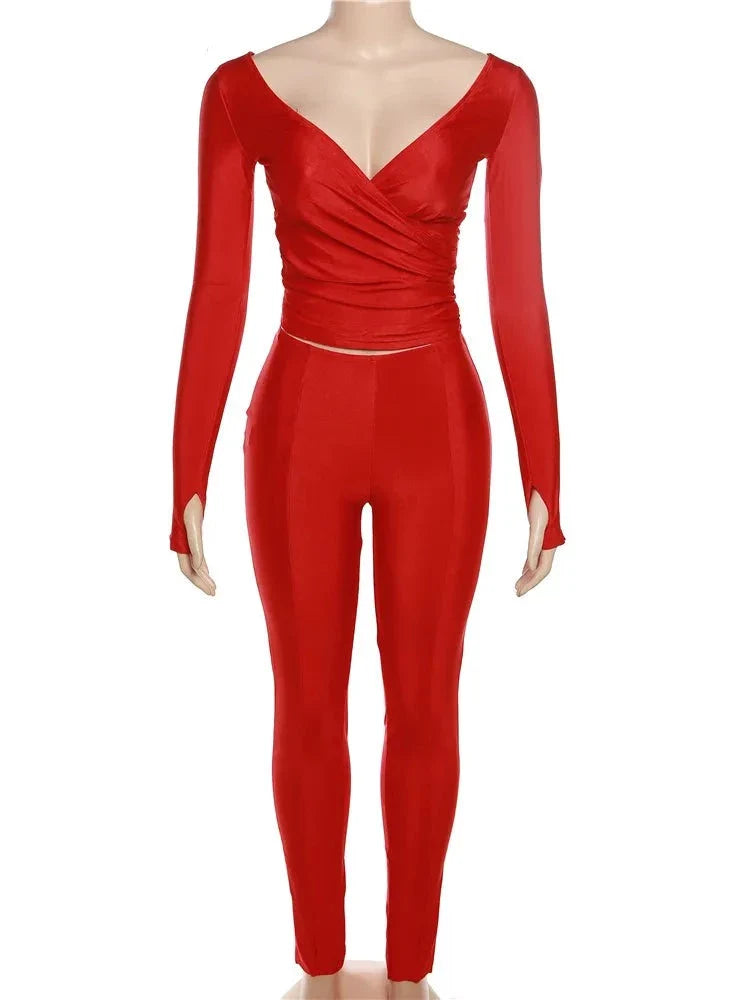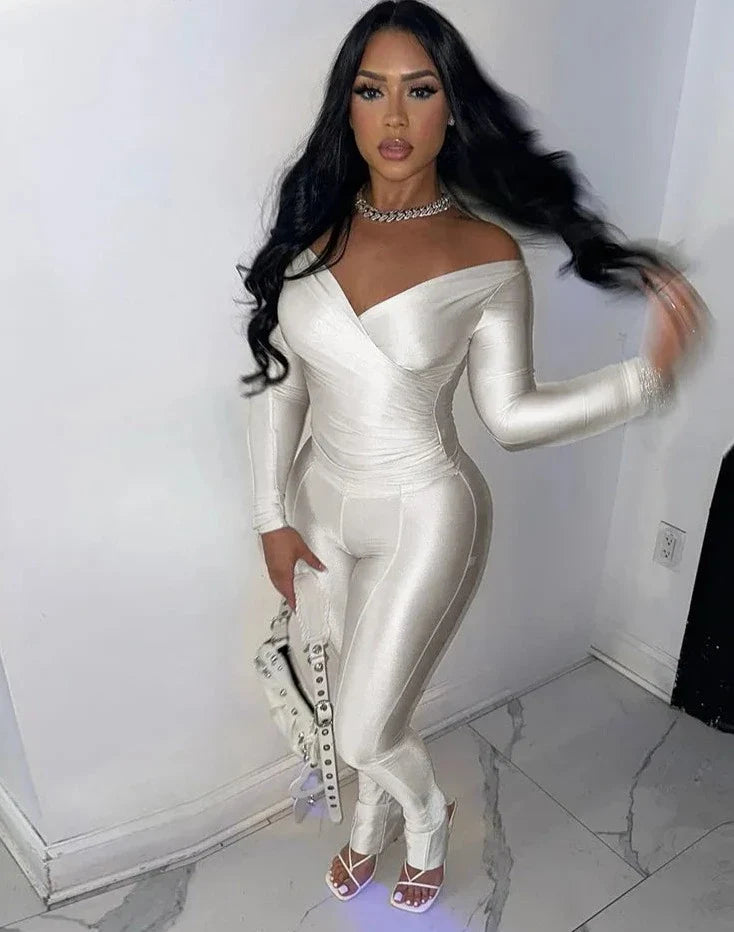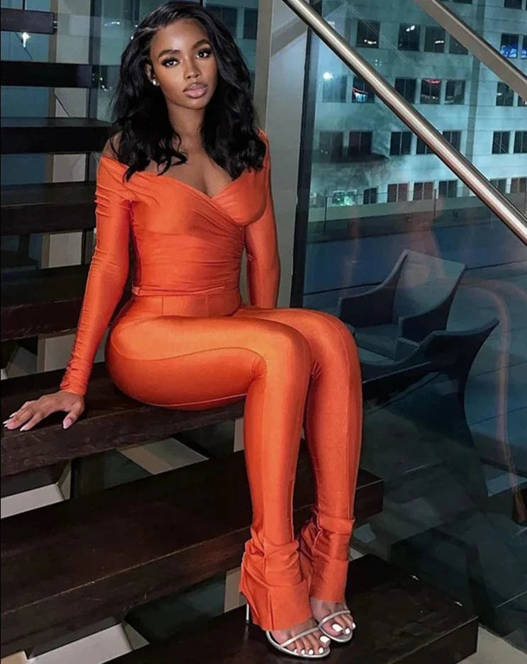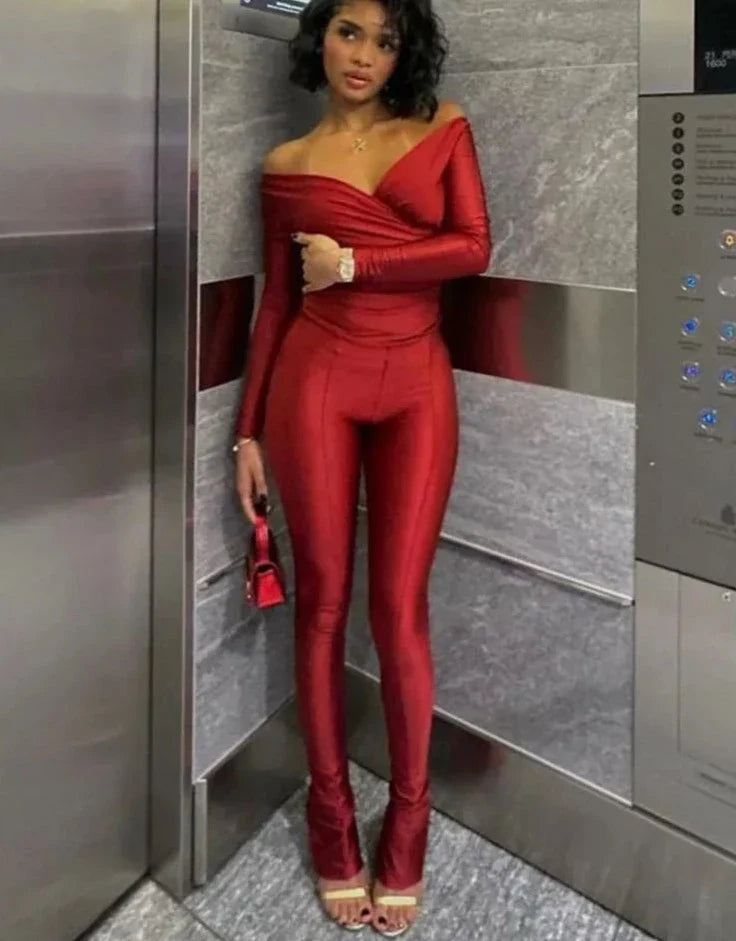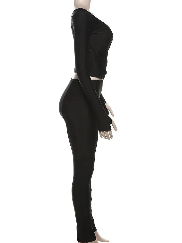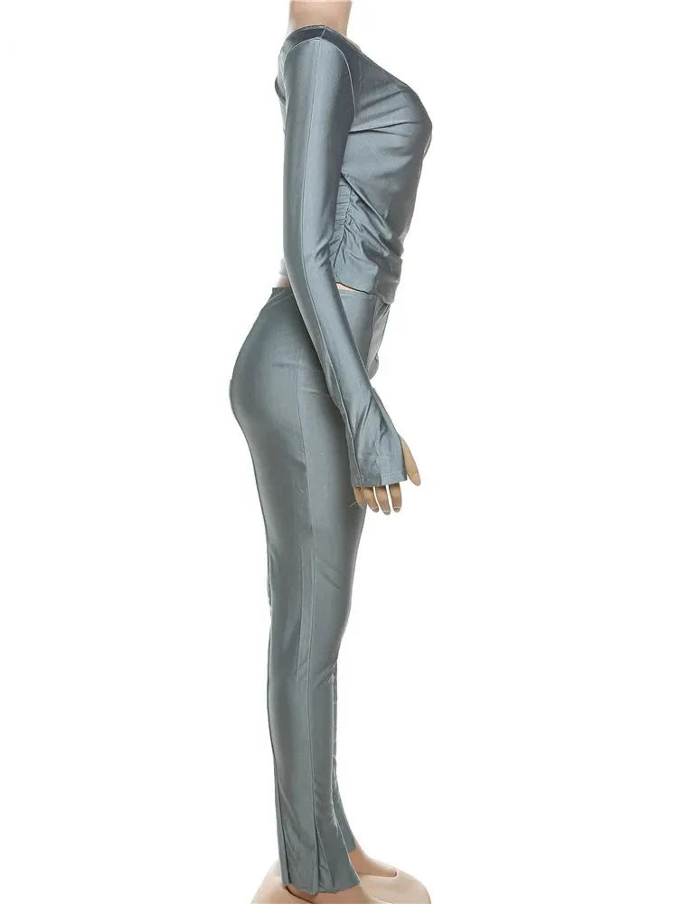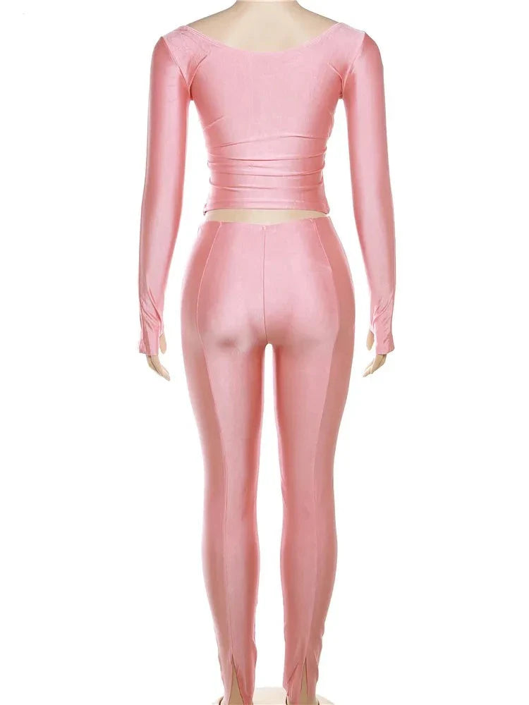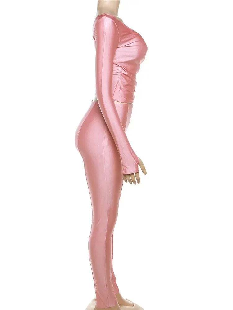 This Bar Set High Long Sleeve Matching Set is sure to be the answer to all your styling dilemmas. Featuring a stretch high shine material with a long sleeve top and high waisted pants to match. We are in love!