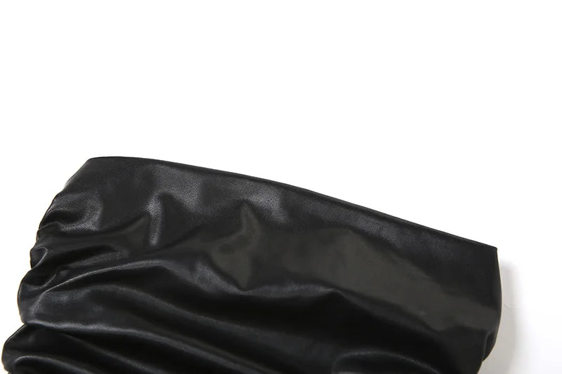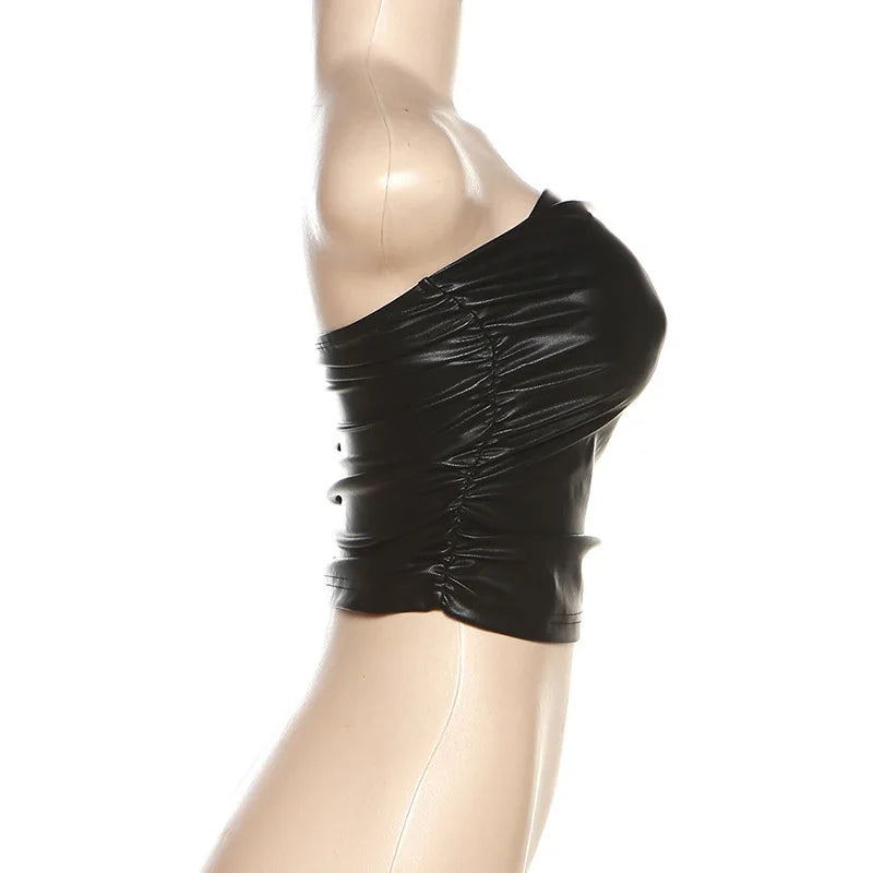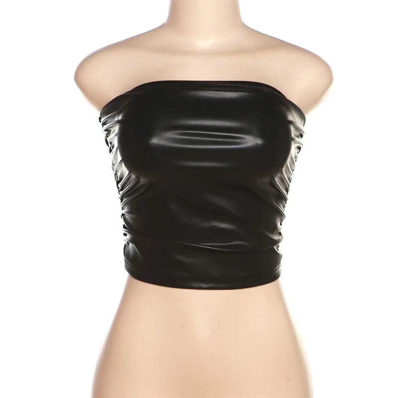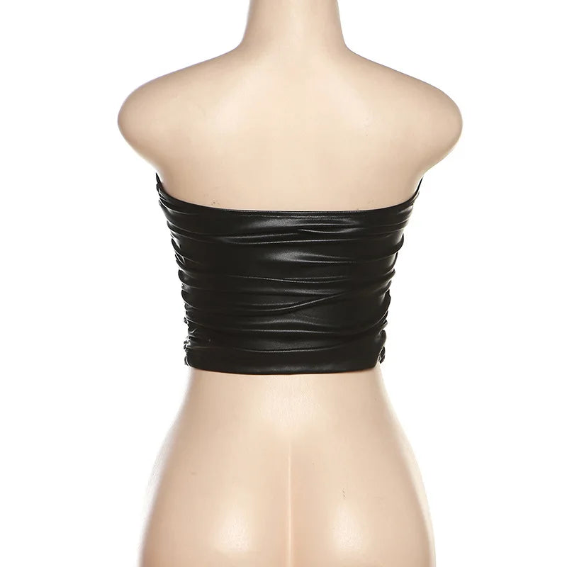Inject some leather feels into your look with this Black Strutter Strapless Tube Top. Brought to you in a black PU leather material with a bandeau neckline and side ruched detailing. what more could you want? Style this black top with your favorite bottoms. heels and statement accessories for an effortlessly chic look that is sure to bring all the attitude to your weekend plans.