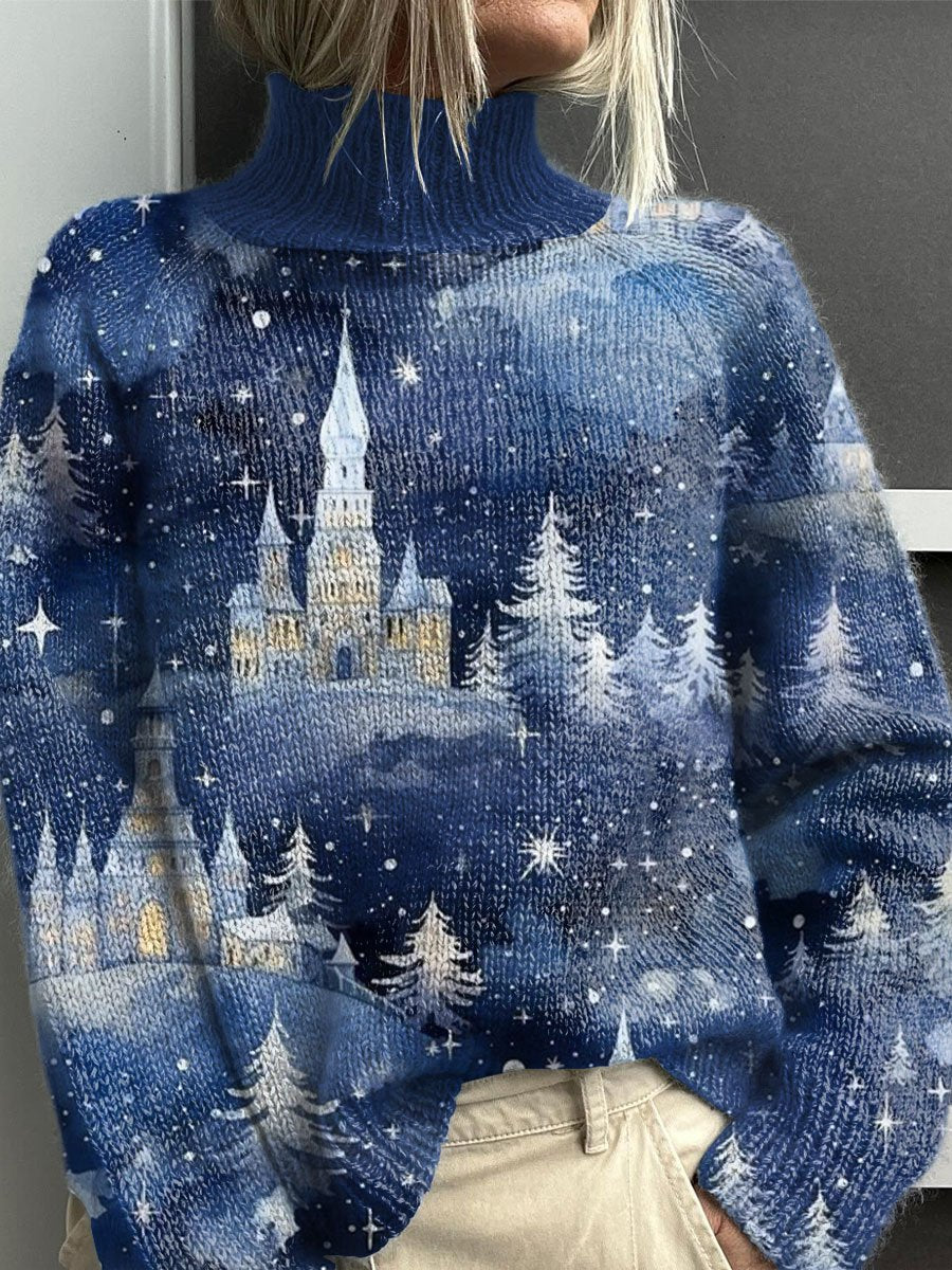 Blue Christmas Christmas Tree Pattern Art Print Knit Turtleneck Pullover Sweater