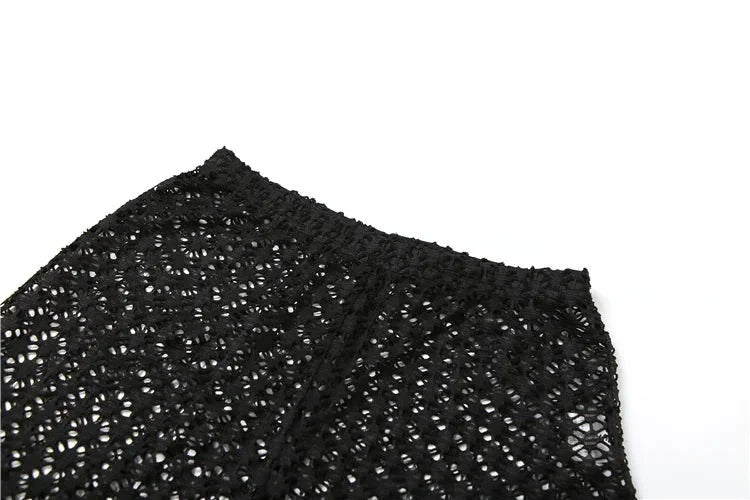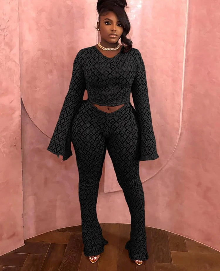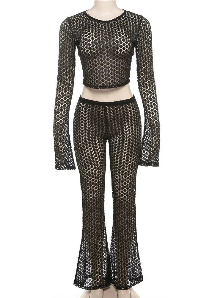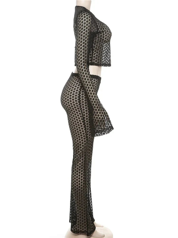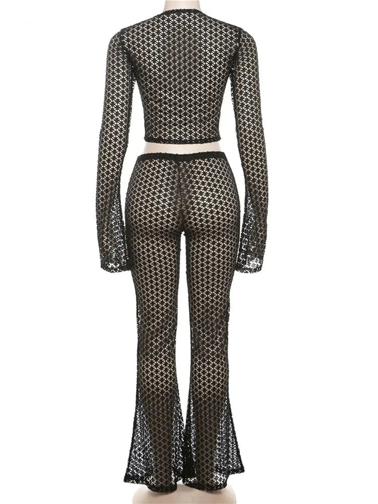 Bring an instant luxe touch to your wardrobe with this Bohemian Dreams Two Piece Set. It's made from a crochet material with slight stretch. long sleeve top. and matching flared pants that will nail all the trends this upcoming season that will give you that seriously chic vibe. This matching set can be dressed up or down no matter what plans you have and we're obsessed.