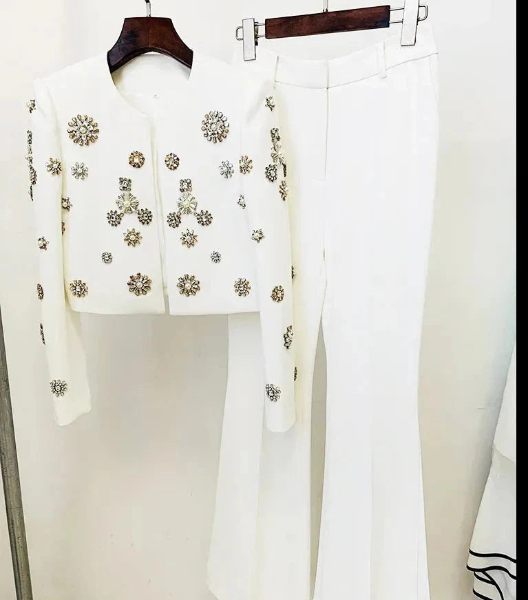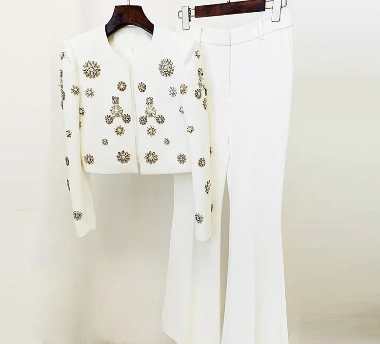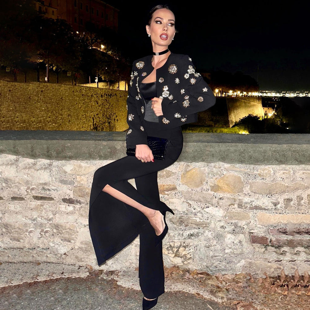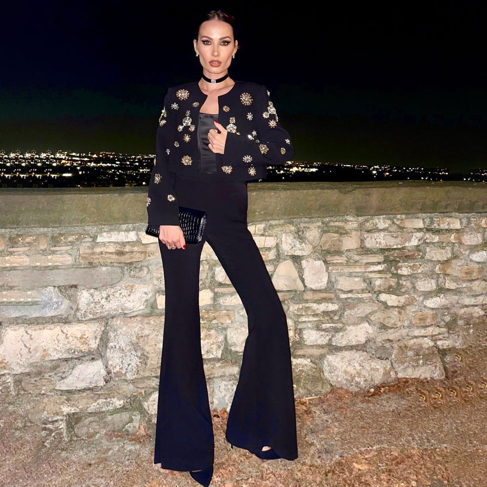 The Cassidy Rhinestone Jacket & Flare Pants Set is the perfect combination of boss chick and sophisticated. This two-piece set features a statement-making rhinestone-embellished jacket and a pair of flared pants. creating an ensemble that's sure to make a chic impression.