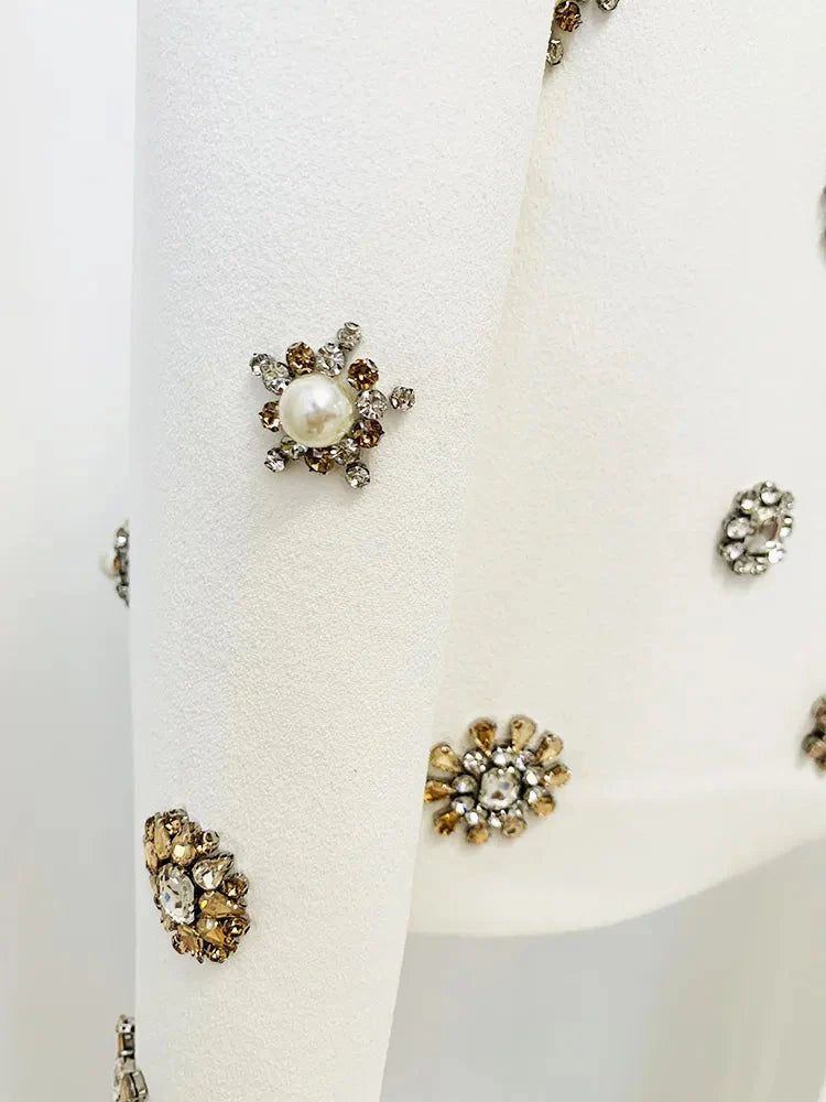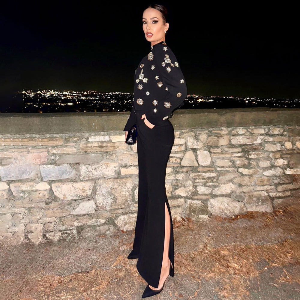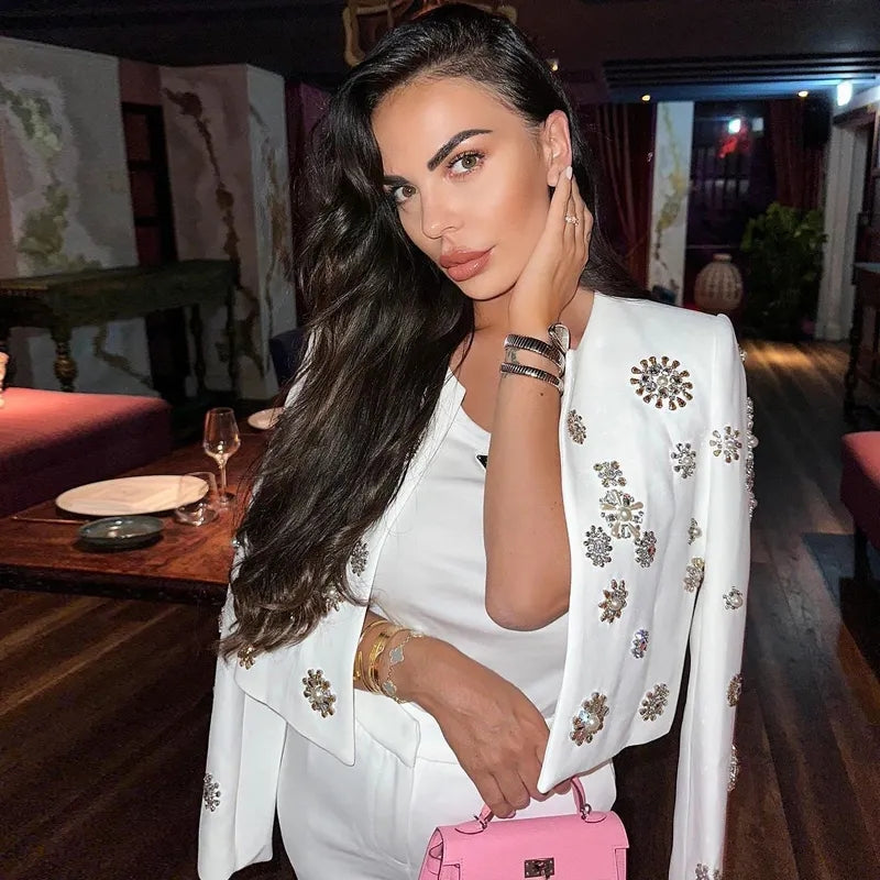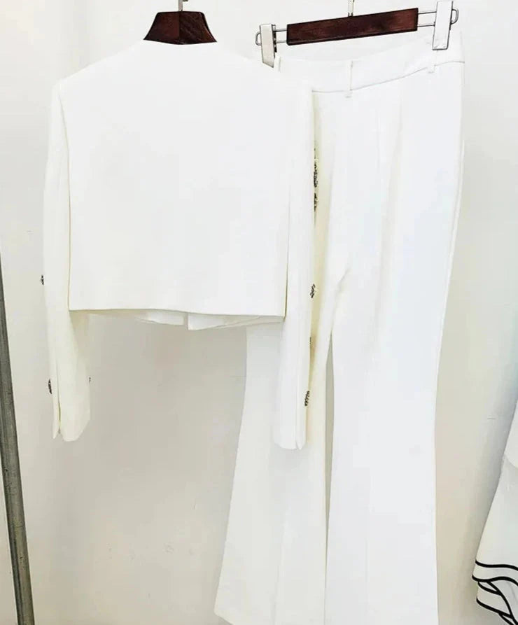 The Cassidy Rhinestone Jacket & Flare Pants Set is the perfect combination of boss chick and sophisticated. This two-piece set features a statement-making rhinestone-embellished jacket and a pair of flared pants. creating an ensemble that's sure to make a chic impression.