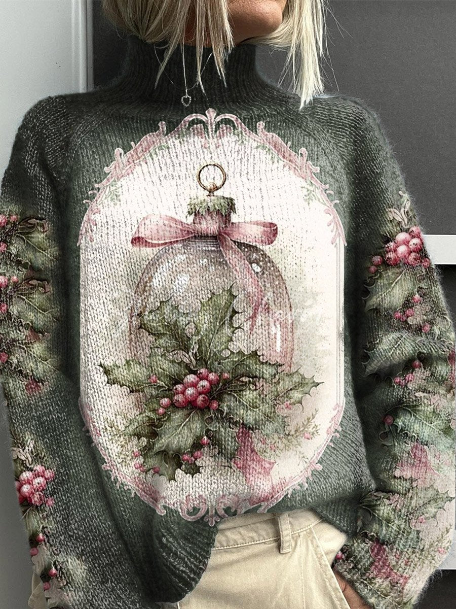 Christmas Art Print Knitted Turtleneck Pullover Sweater