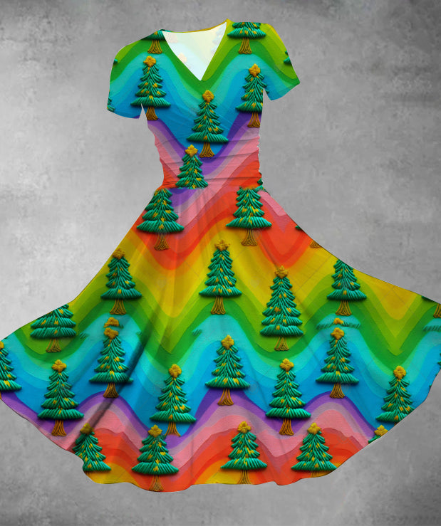 Christmas Colorful Christmas Tree V-Neck Swing Dress