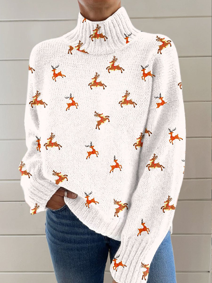 Christmas Elk Print Knit Turtleneck Pullover Sweater