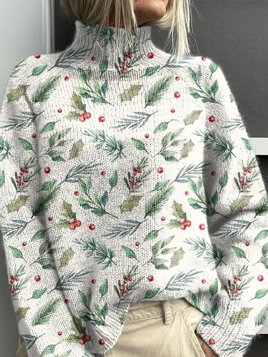 Christmas Holly Art Print Knit Turtleneck Pullover Sweater