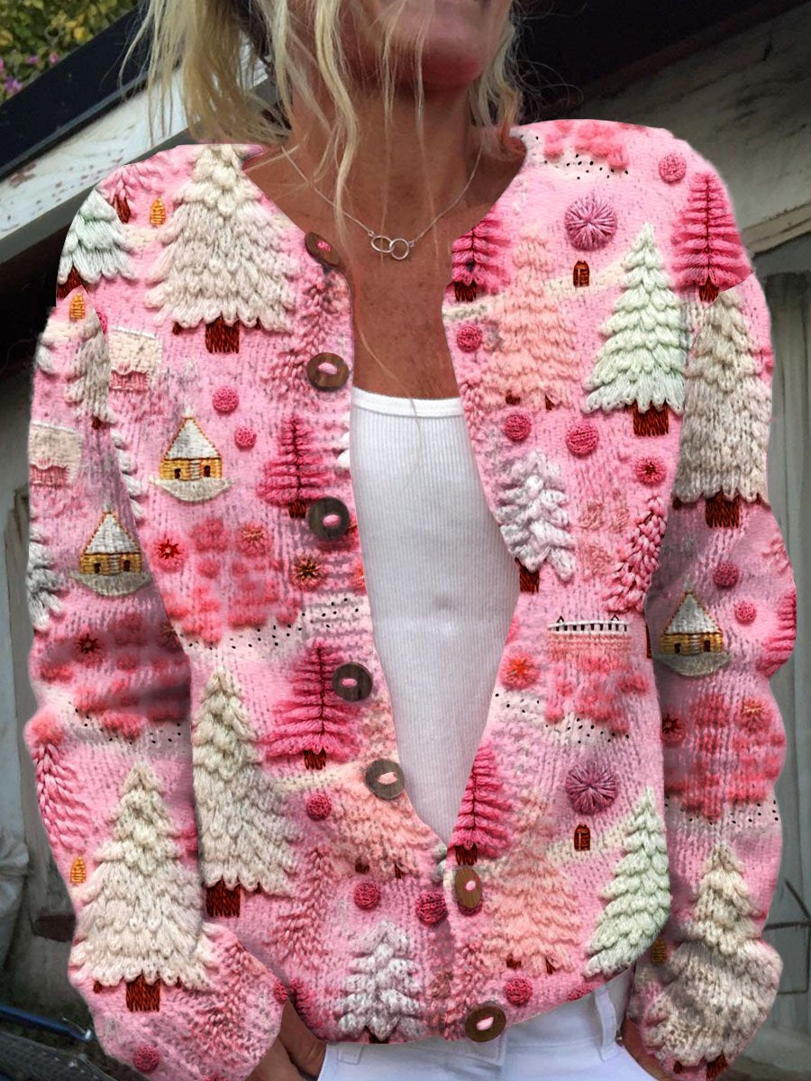 Christmas Tree Art Print Buttoned Cardigan Sweater