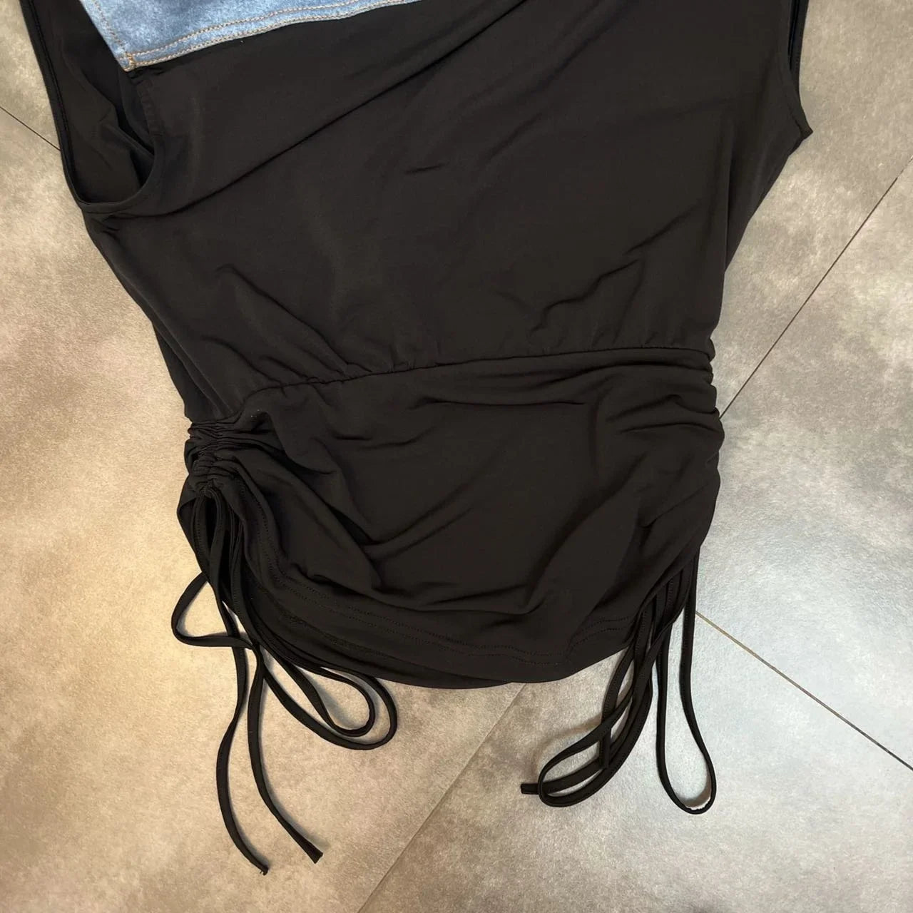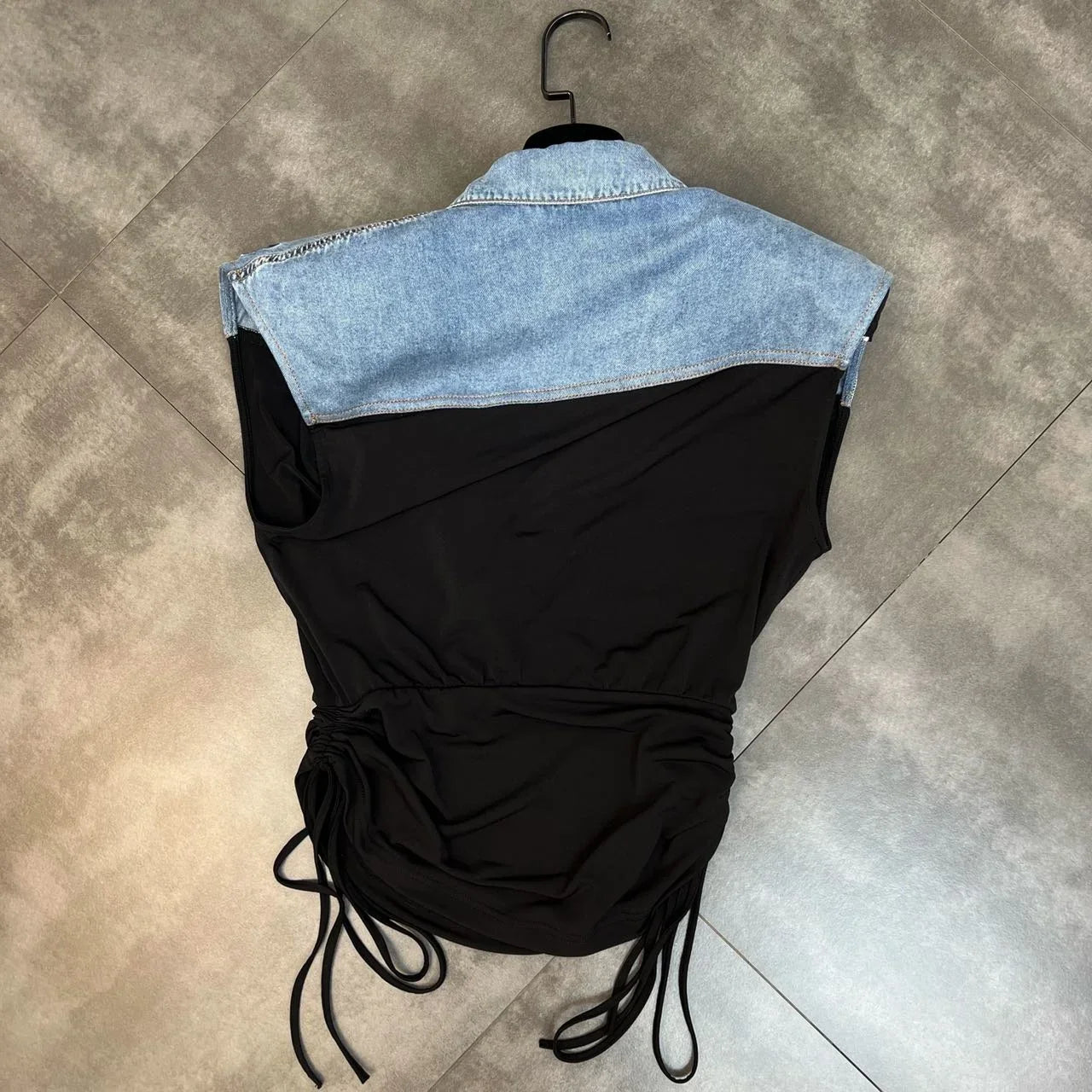 This Come With Me Drawstring Top is perfect for showing off your style. Featuring a blue denim material and black deconstructed cloth fabric with a drawstring design and padded shoulders. team this top with the matching Come With Me High Waist Maxi Skirt and mule heels for a look we're loving.