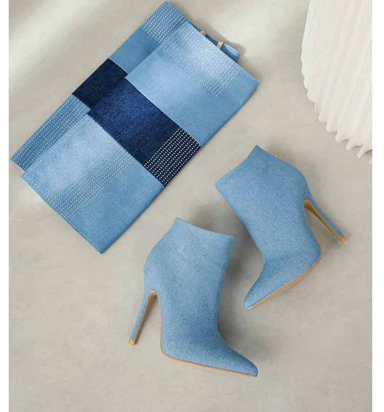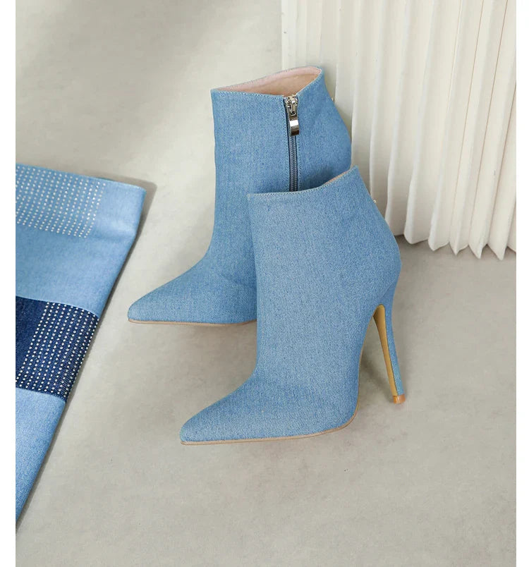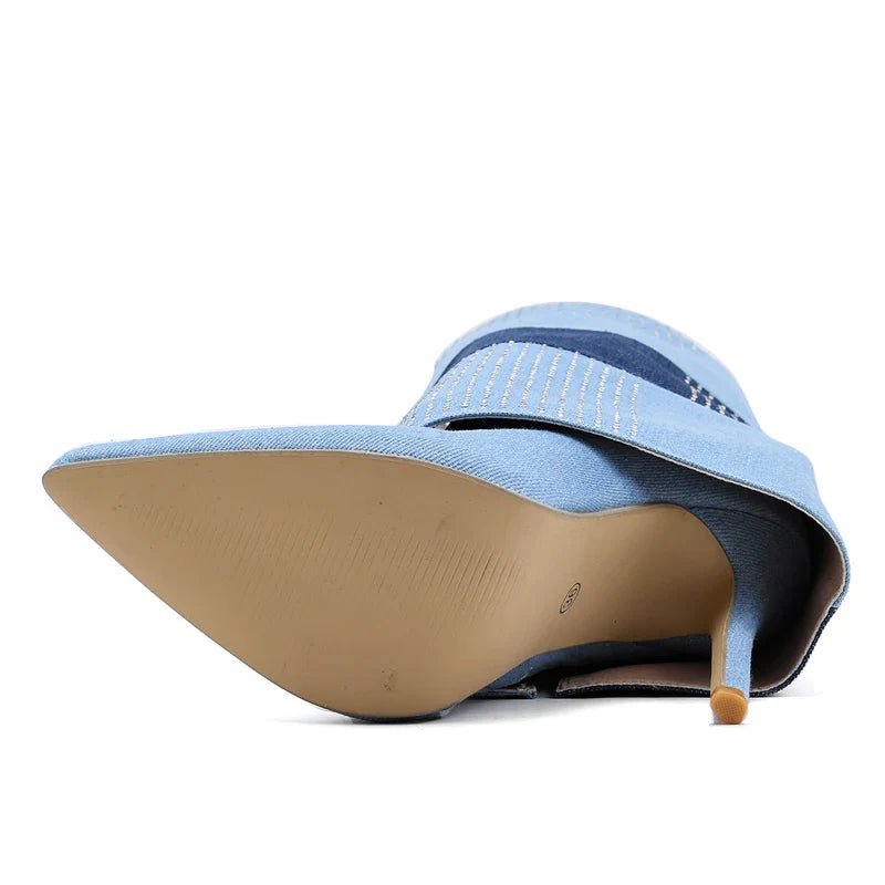 Elevate your style with our Crystal Denim Boots! A must-have for any fashionista. these versatile boots can be worn as chic ankle boots or bold knee-highs. You'll love how they effortlessly take any outfit to the next level. Get ready to turn heads and make a statement with these must-have boots.