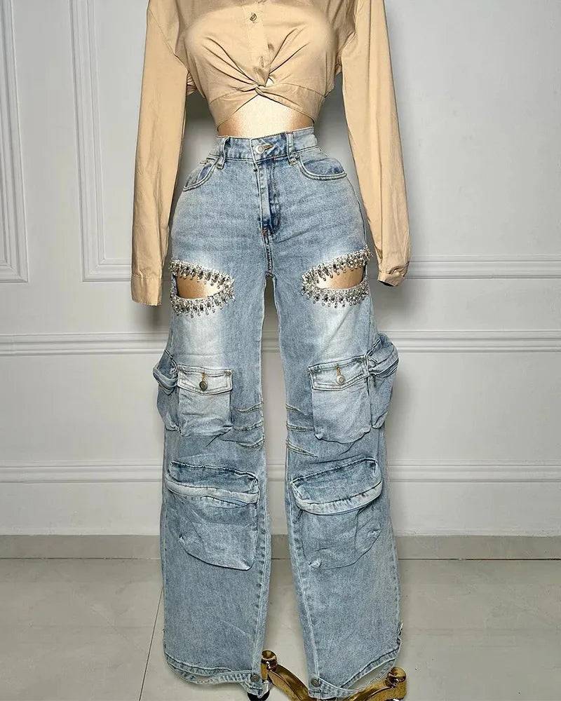 Discover the perfect balance of style and functionality with our Cutout Diamonds Multi Pockets Jeans. Crafted with precision. these jeans feature unique cutout diamond details for a modern and edgy touch. With multiple pockets. you'll have plenty of storage space while staying on trend.