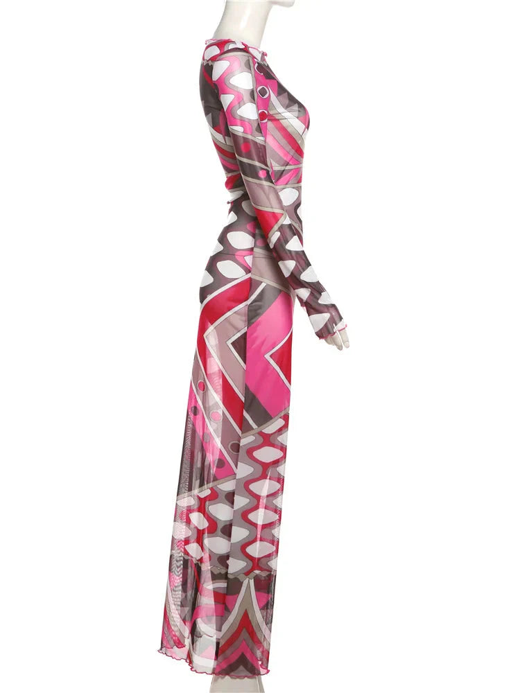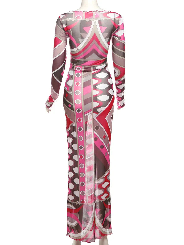 Become the center of attention with this Devine Timing Long Sleeve Mesh Maxi Dress. you know you won't be able to resist adding it to your basket. Made from a mesh abstract print fabric with long sleeves. this maxi dress is bound to make you feel like your best self. Team with clear heels. a clutch bag and a whole lot of confidence for a look that everyone will be obsessed with.