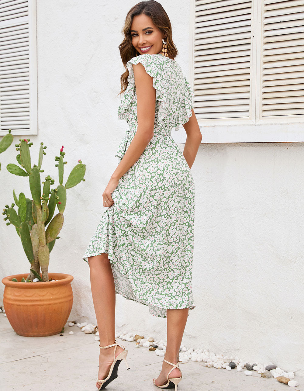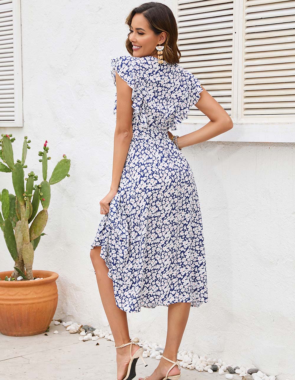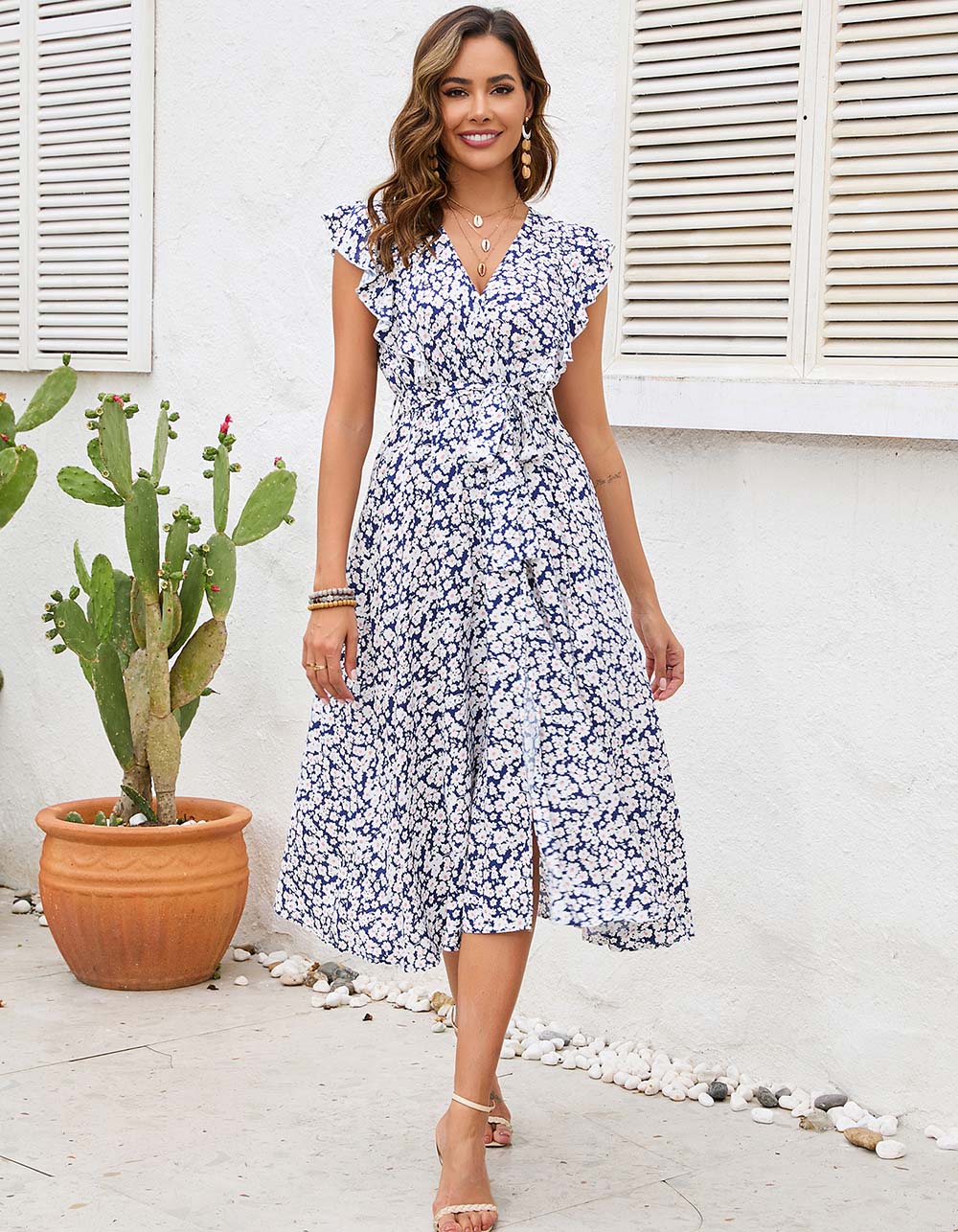This Disty Floral Slits Flounce Sleeve Long A-Line Dress offers a unique combination of cute. elegant. and casual style. It features a V-neck. short flounce sleeves. a high waist. and a ruffle hem for a flattering fit. The viscose material is slightly stretchy and has a beautiful disty floral print with slits detail for added texture. Perfect for any occasion.