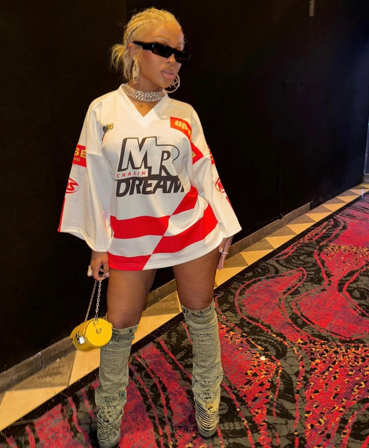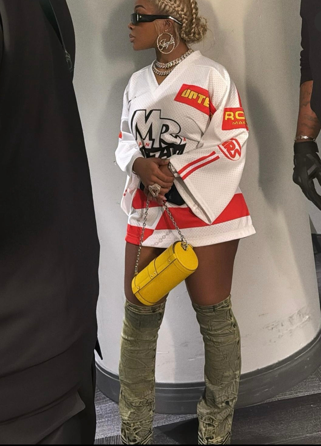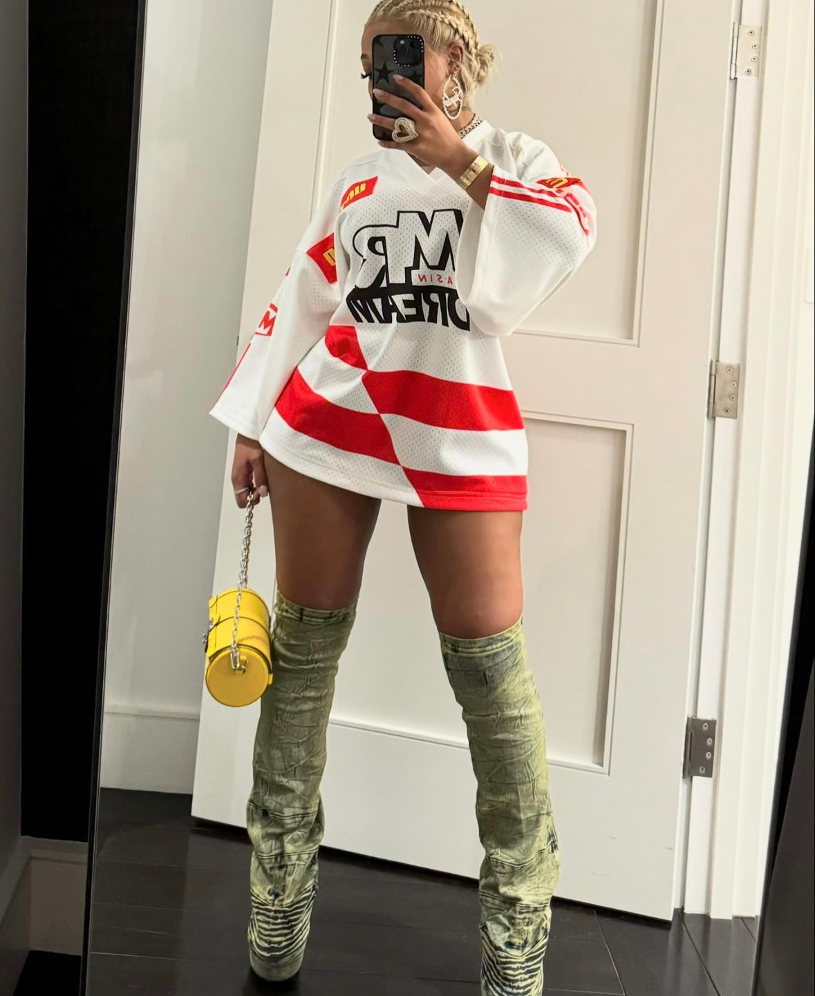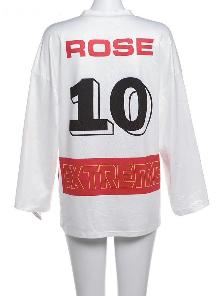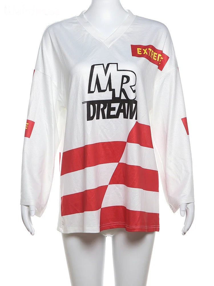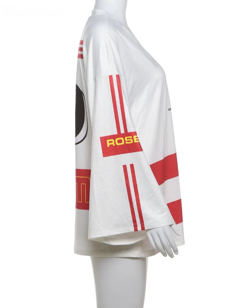 Add some edge to your off-duty wardrobe with this Dream Team Oversized Top. Brought to you in a light weight PU material with a V neck style and an all over sports print design. how could you say no? Pair effortlessly with denim shorts. accessories and heels for a look like no other.