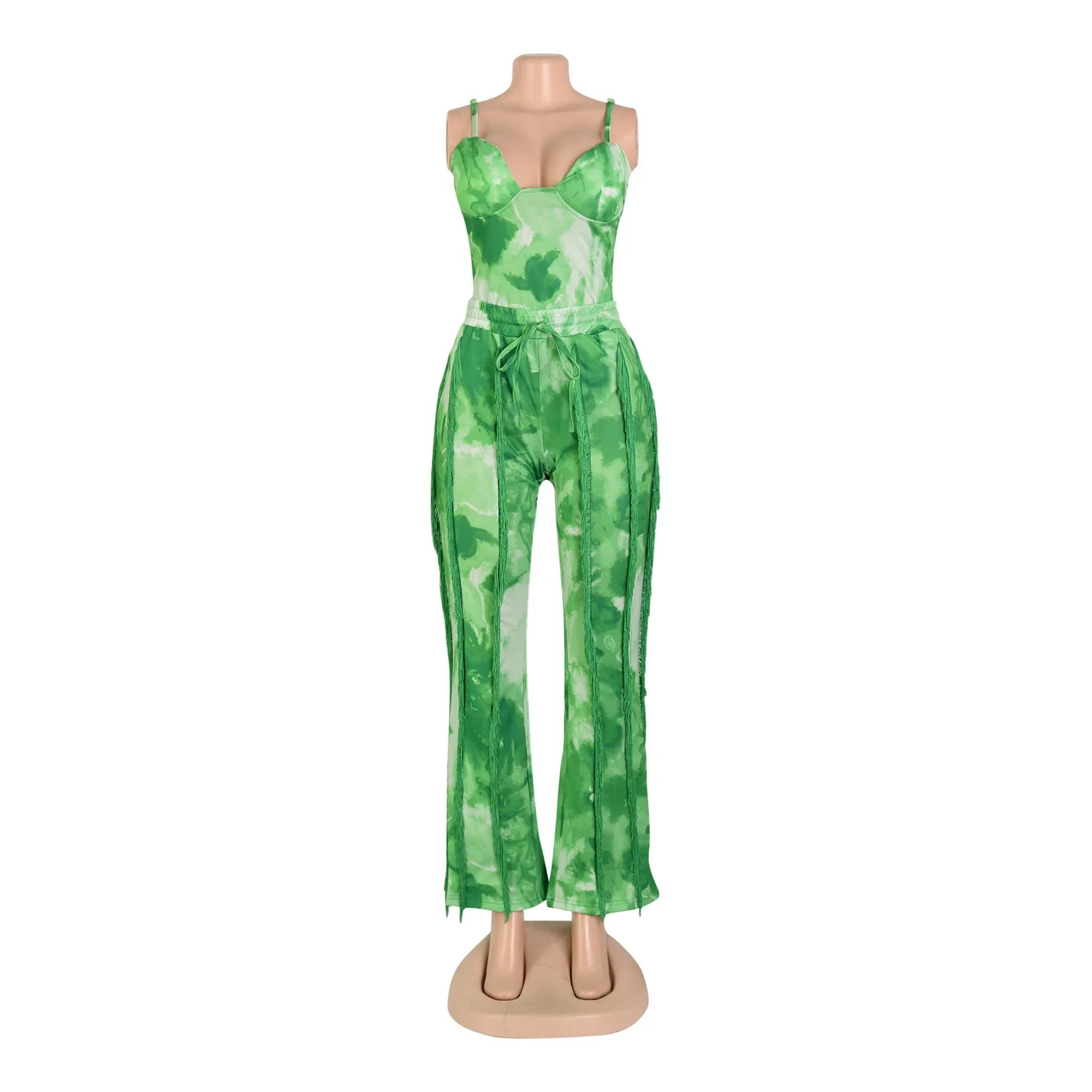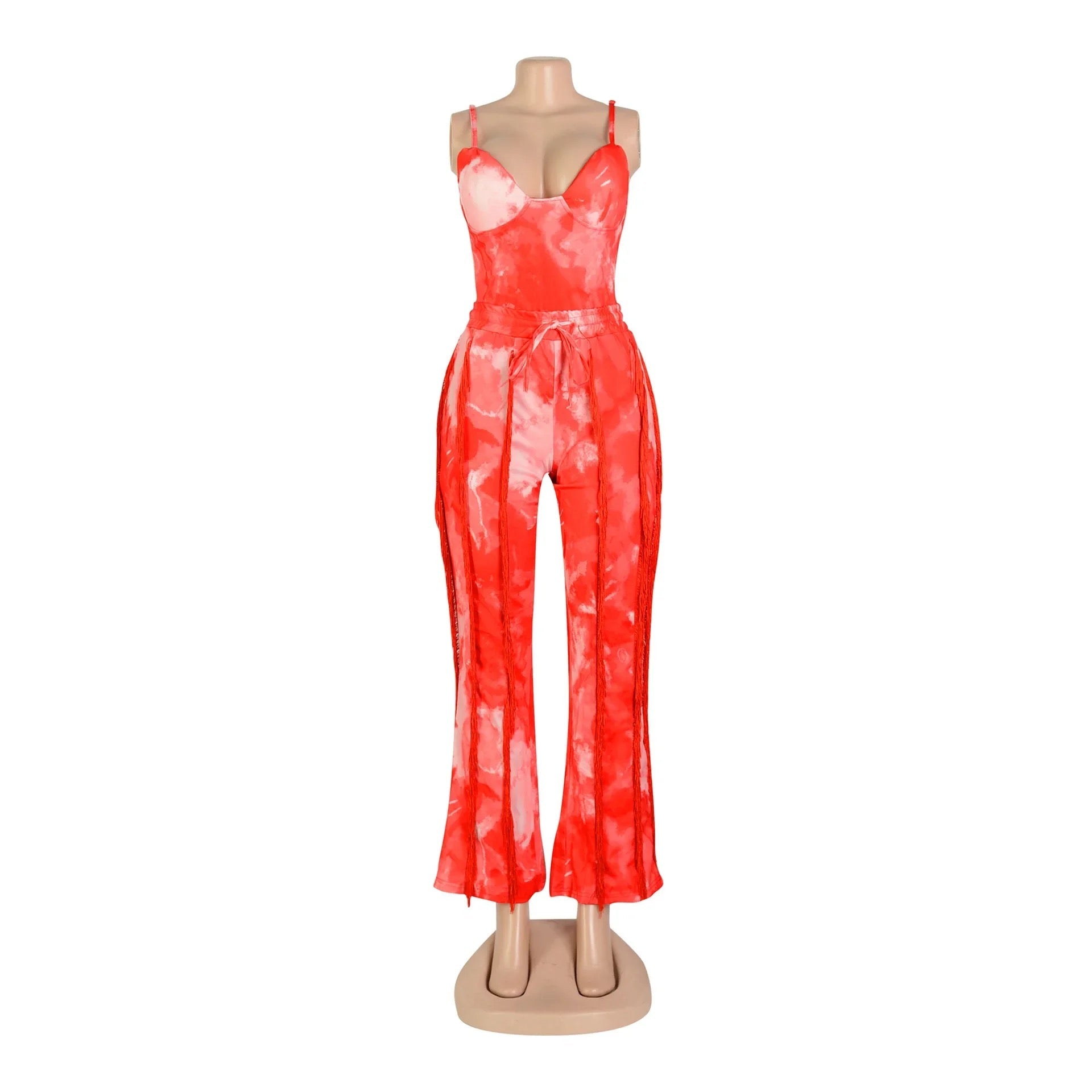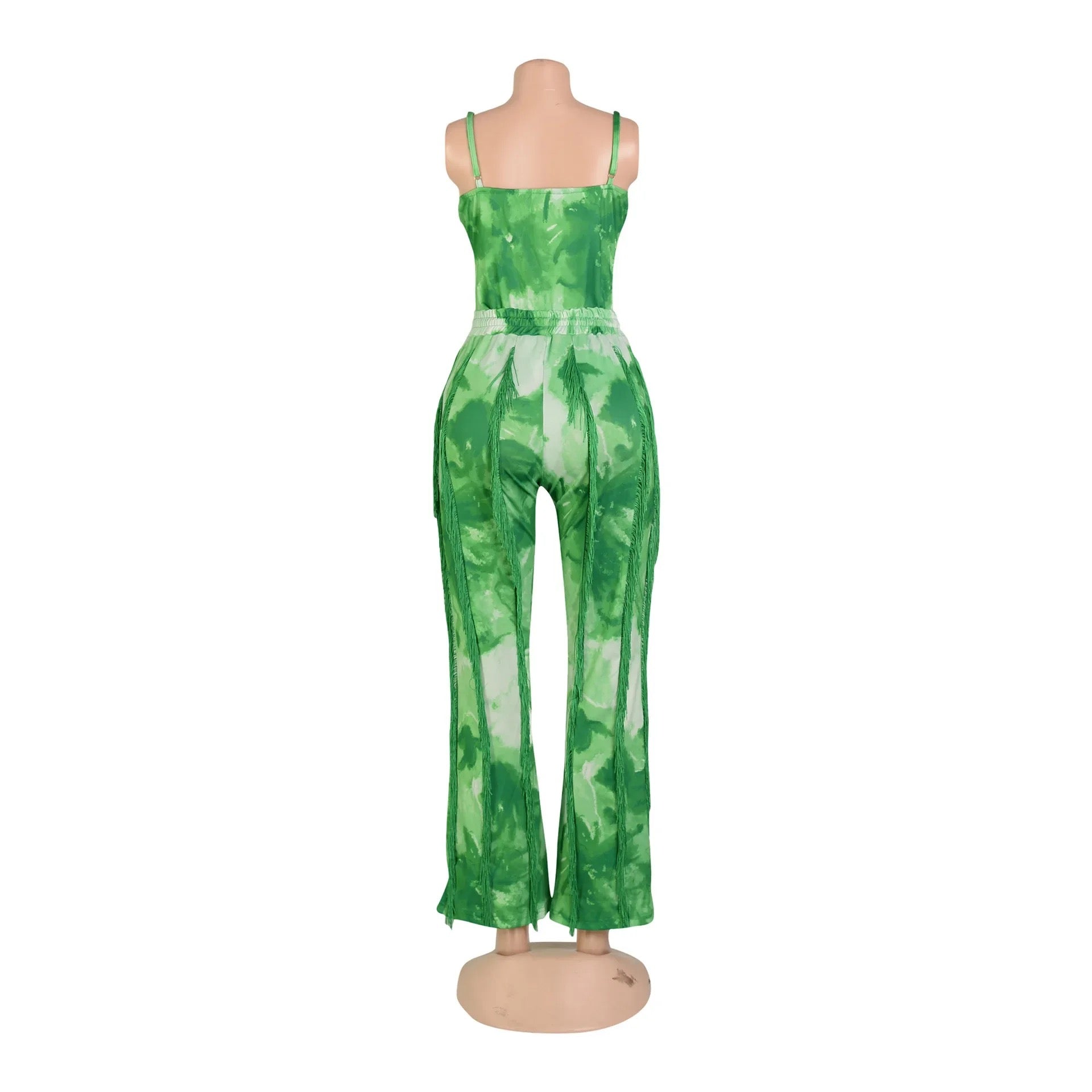 Create a look no one will forget this season with this Excuse Me Come Again Tie Dye Pants Two Piece Set. This two piece pants set is brought to you in a tie dye PU stretch material with a bodysuit and high waisted tassel design pants. how could you resist? Complete the look and style this set with sandals and accessories for a vibe like no other.