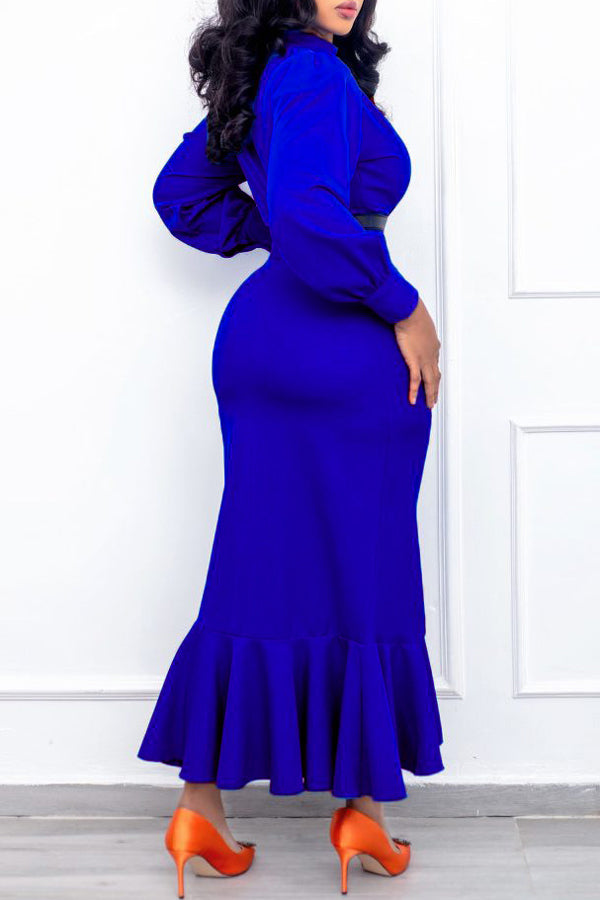 We're glad you've clicked on our new fishtail dress as we're really into its elegant vibes! The mandarin collar and long sleeve cut make this a great choice for any stylish girl.
