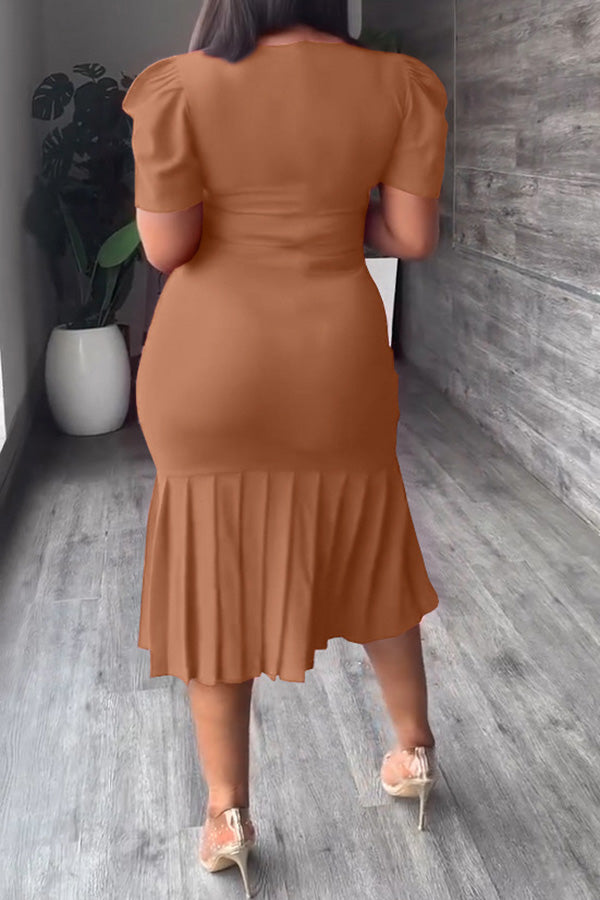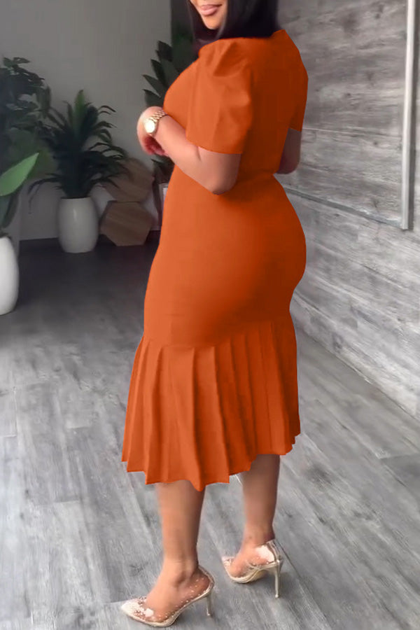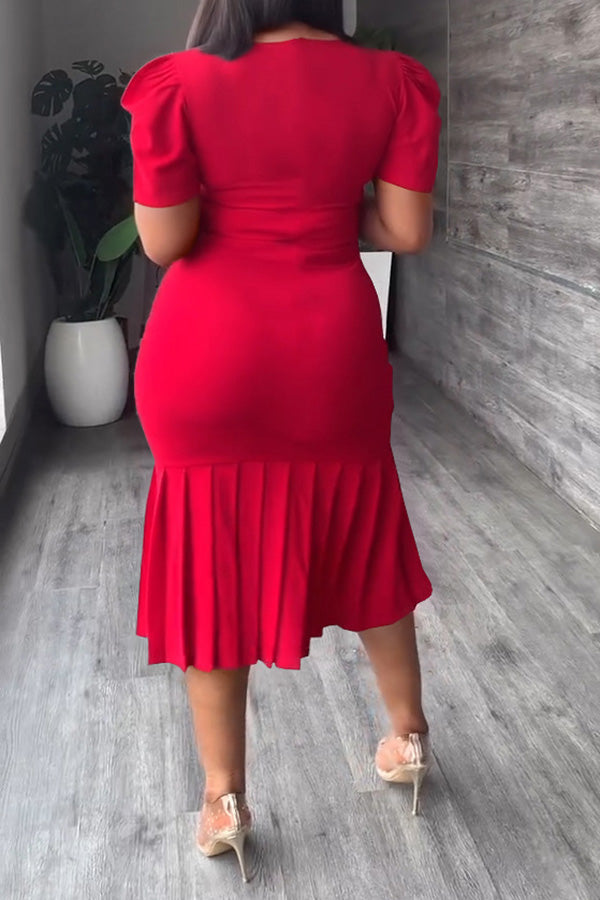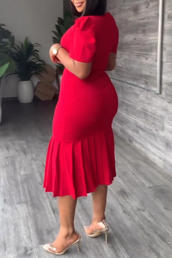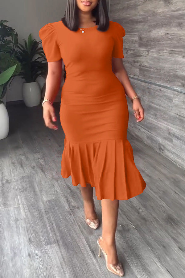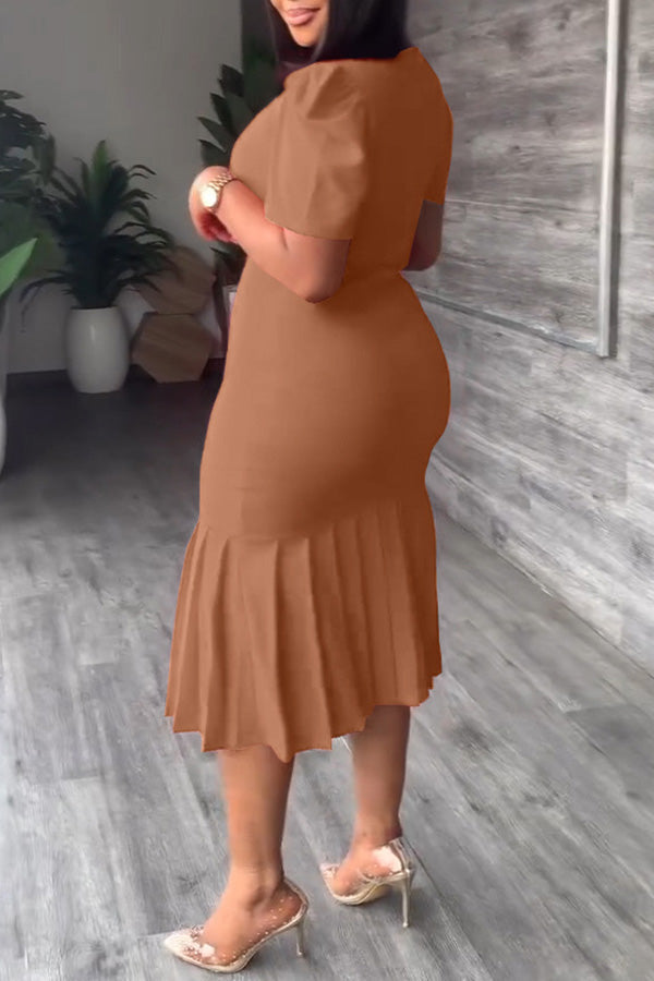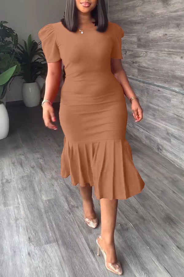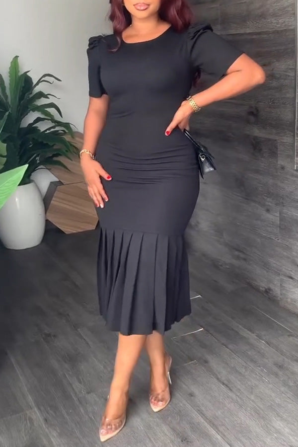 Stay on trend this season in our new elegant. round neck dress. We especially love the solid color fabric and think this piece will be a new favorite in your closet!
