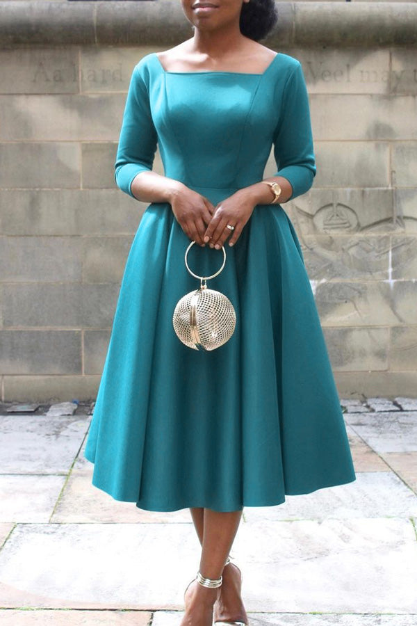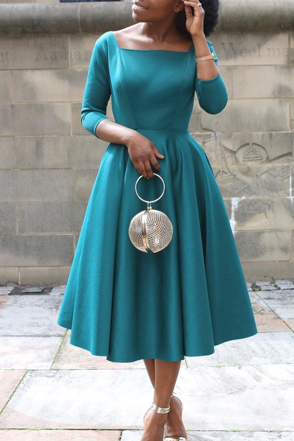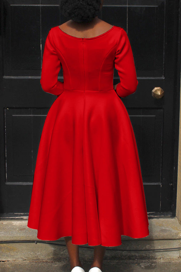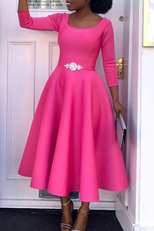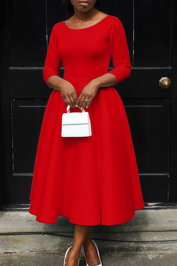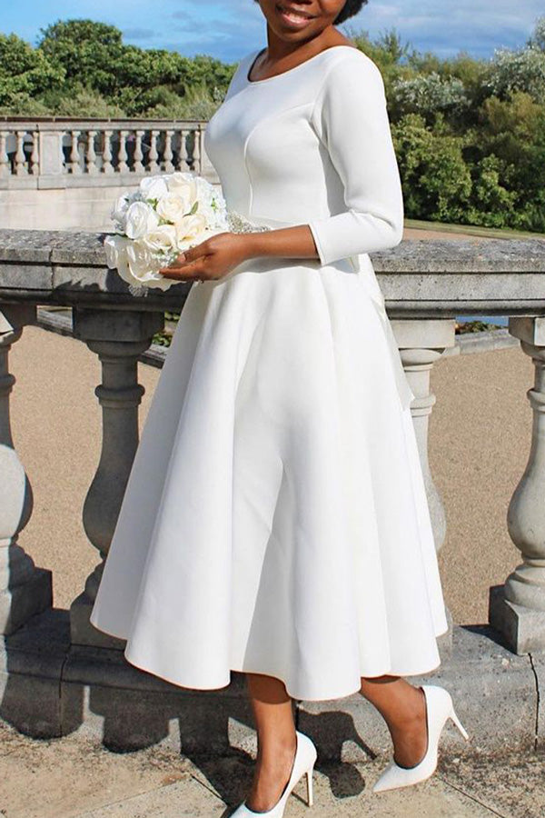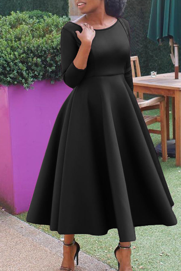 Stay on trend this season in our new elegant. round neck dress. We especially love the solid color fabric and think this piece will be a new favorite in your closet!