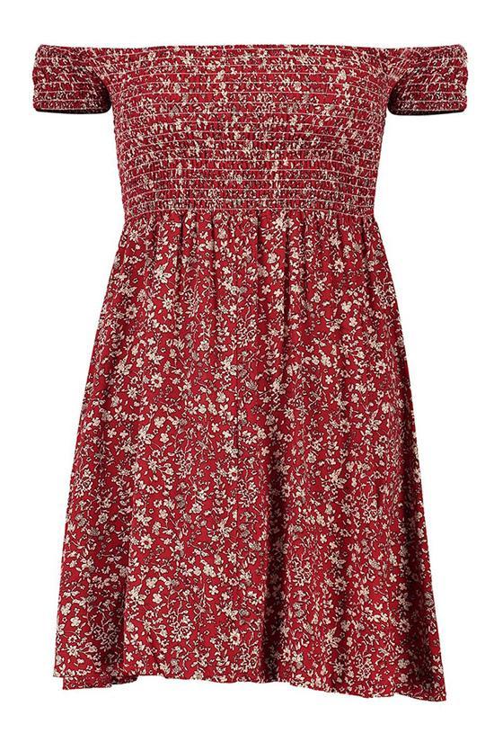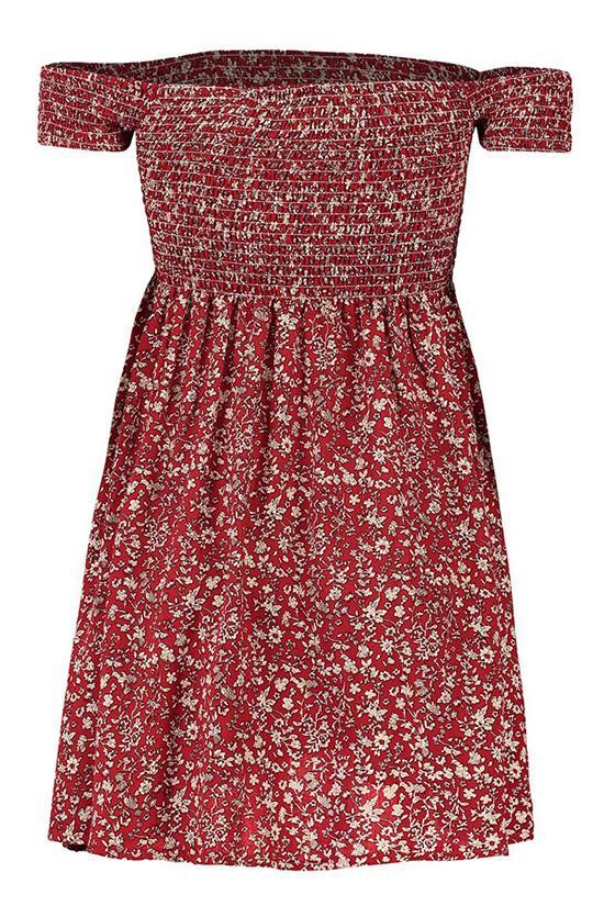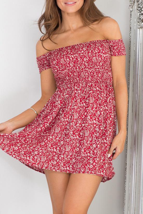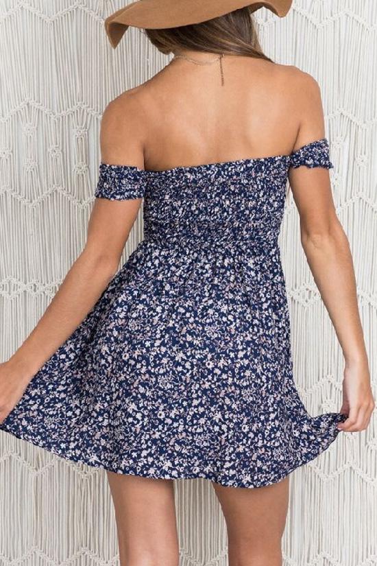 Cute fit & flare dress featuring allover tiny floral printed. gathering elastic top. off-the-shoulder with short sleeve design. good for holiday or daily wear.