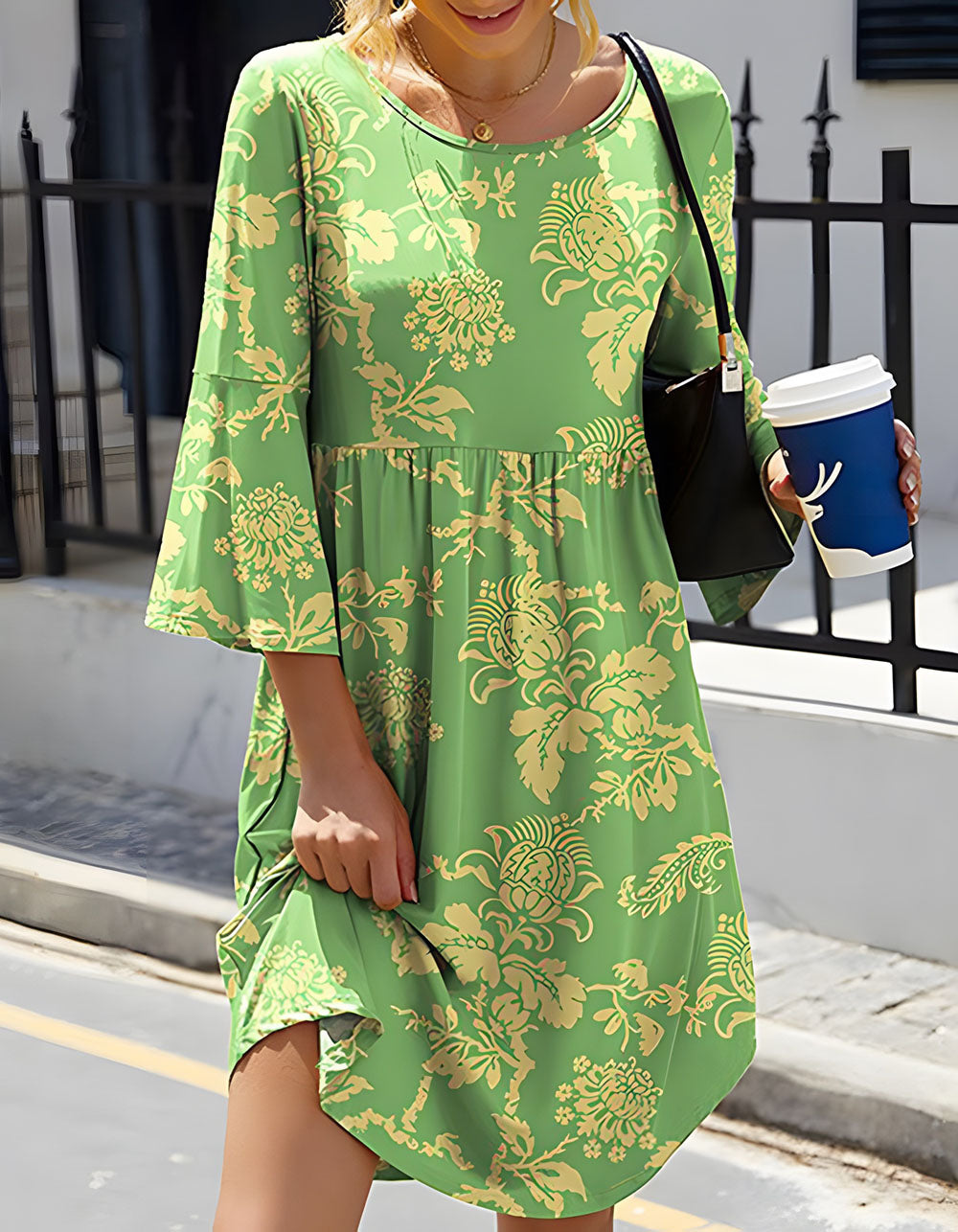 This Floral Print 3/4 Sleeves Round Neck Midi A Line Dress is perfect for any occasion. Crafted from non-stretch cotton. this dress is sure to be a comfortable choice. Choose from 3 lovely colors - green. yellow. and pink - and a range of styles to suit your taste - cute. casual. and elegant. The round neck. ruffle hem. and midi length make this dress a timeless classic.