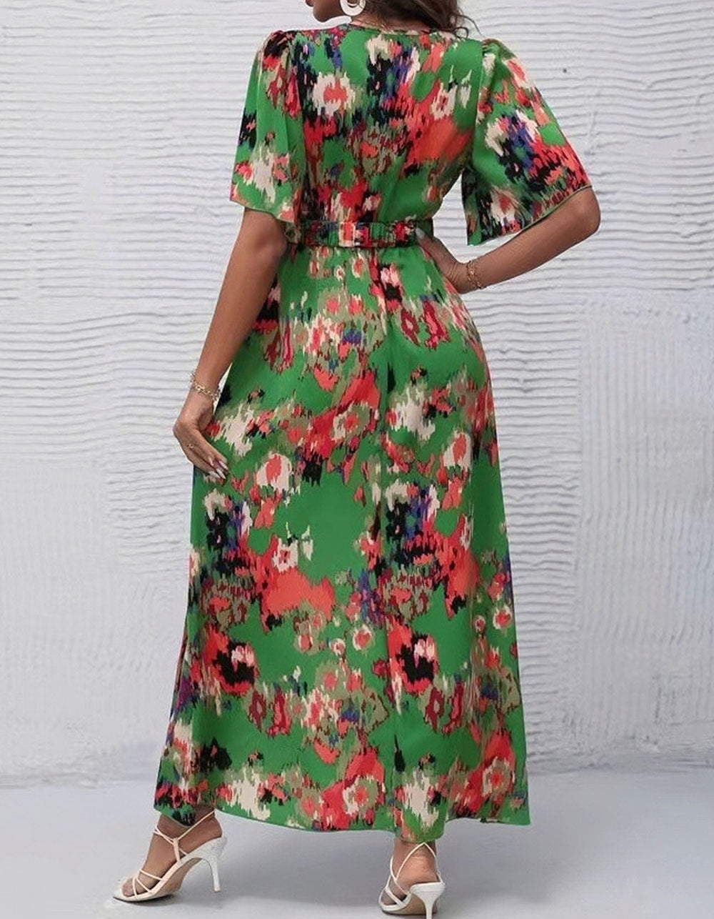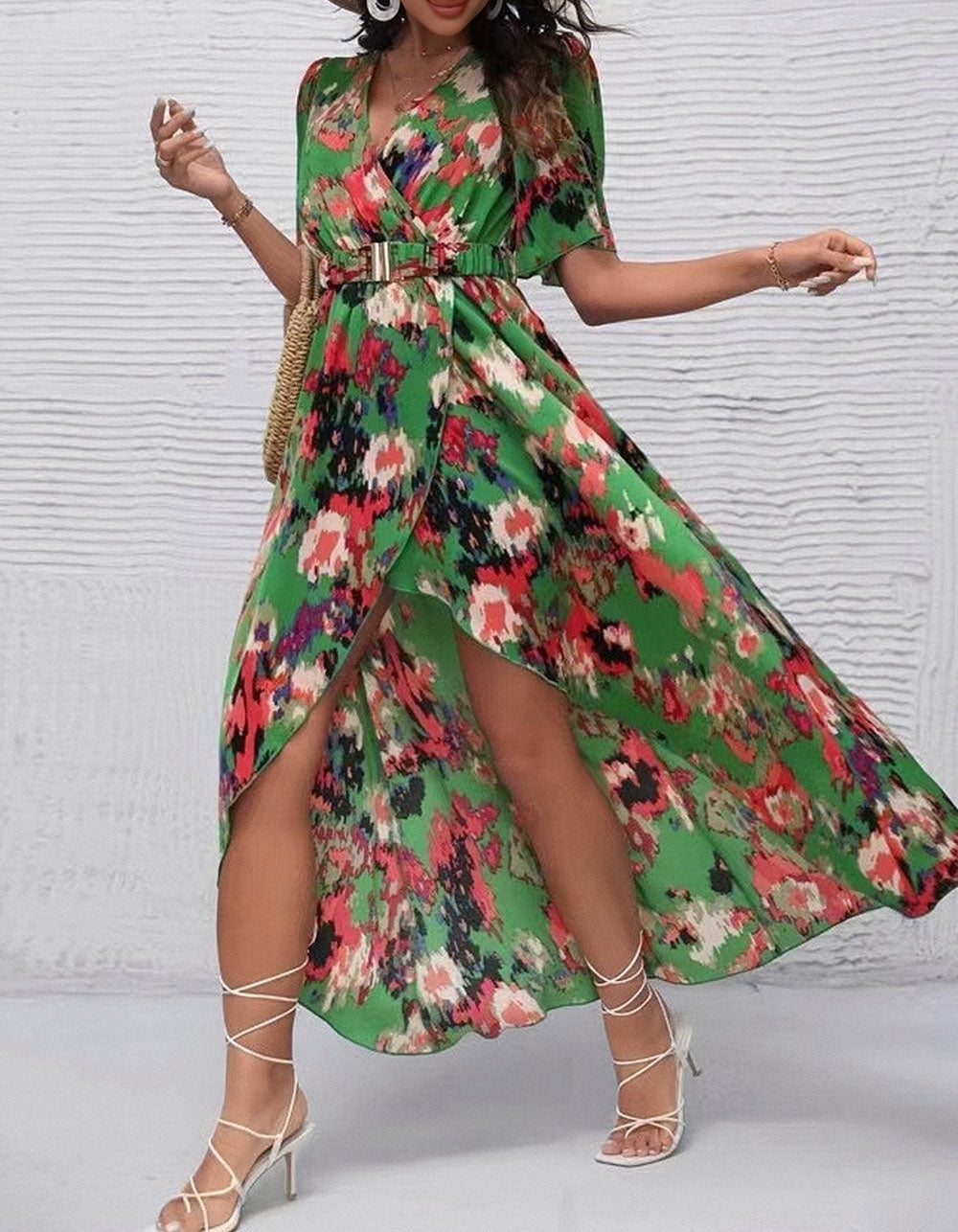 Enhance your wardrobe with this elegant Floral Print V Neck Short Sleeve Asymmetrical Long A-Line Dress. Crafted from high-quality polyester with slight-stretch. it features a fit silhouette. a ruffle hem. and a high-waist. Boasting an eye-catching floral print in shades of green and black. it adds a dose of subtle chic to any look.
