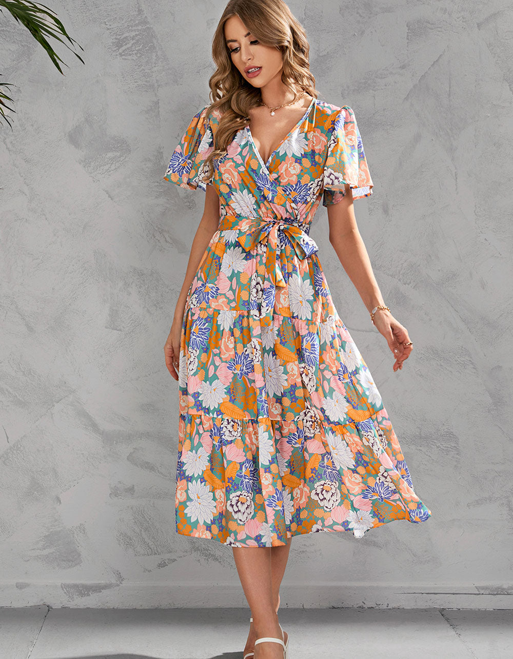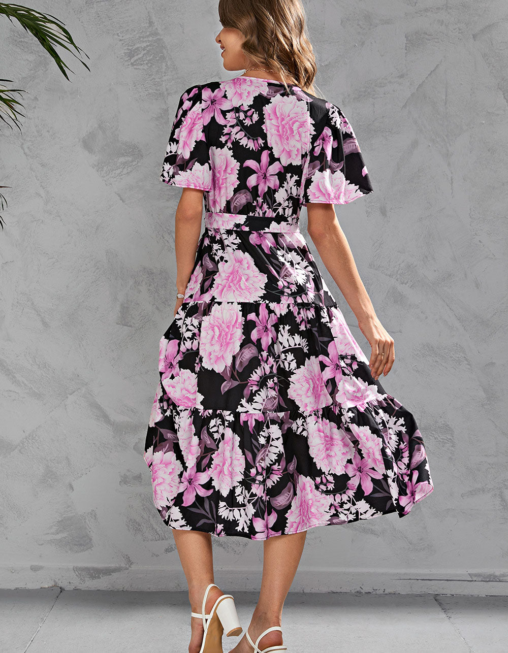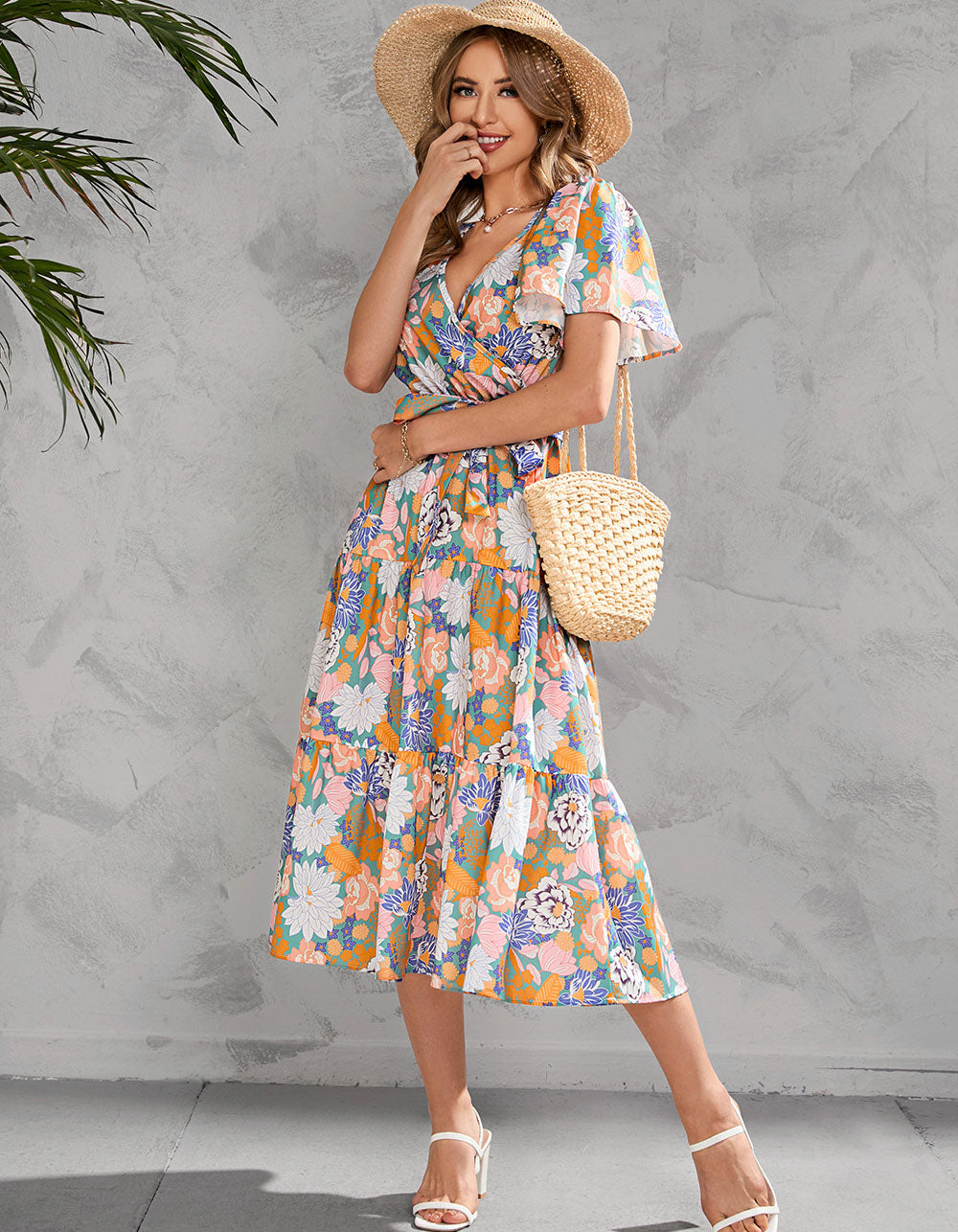 This Floral Printed V Neck Short Sleeve Long A-Line Dress features a variety of stylish and casual elements such as V-neck. short sleeves. colorful printed pattern. ruffle hem. and elegant fit. Crafted from a blend of lightweight Polyester and Cotton. this dress is perfect for any occasion.