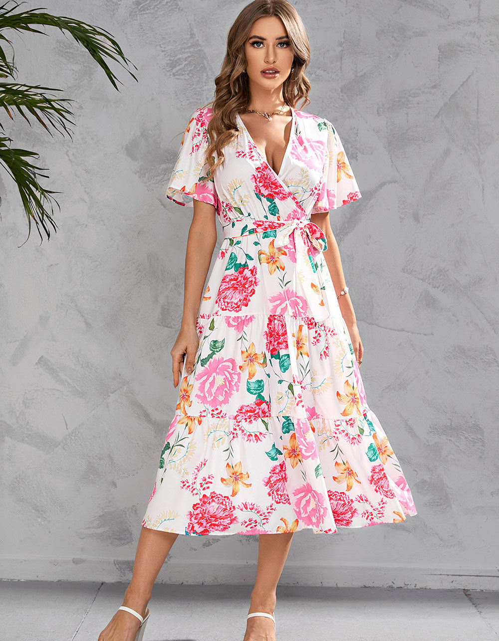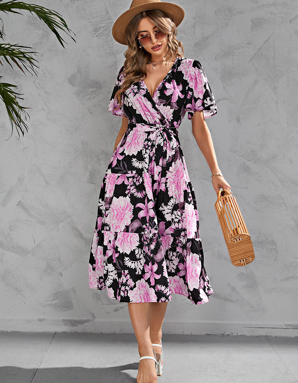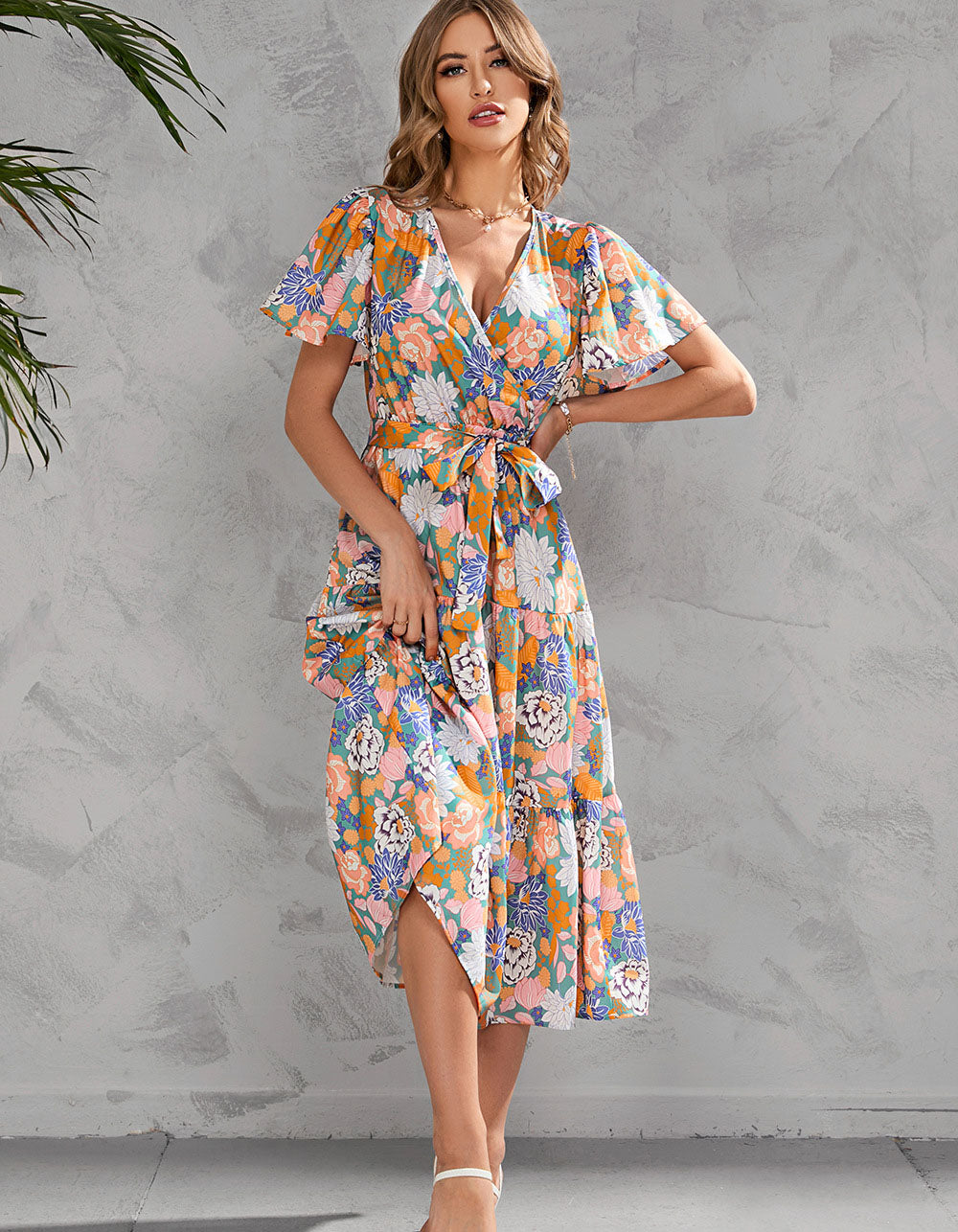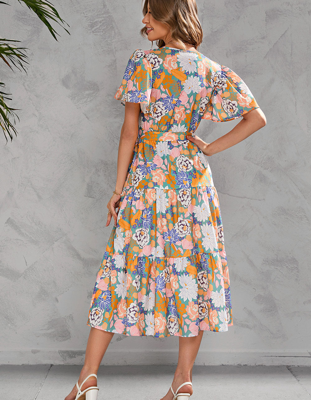 This Floral Printed V Neck Short Sleeve Long A-Line Dress features a variety of stylish and casual elements such as V-neck. short sleeves. colorful printed pattern. ruffle hem. and elegant fit. Crafted from a blend of lightweight Polyester and Cotton. this dress is perfect for any occasion.