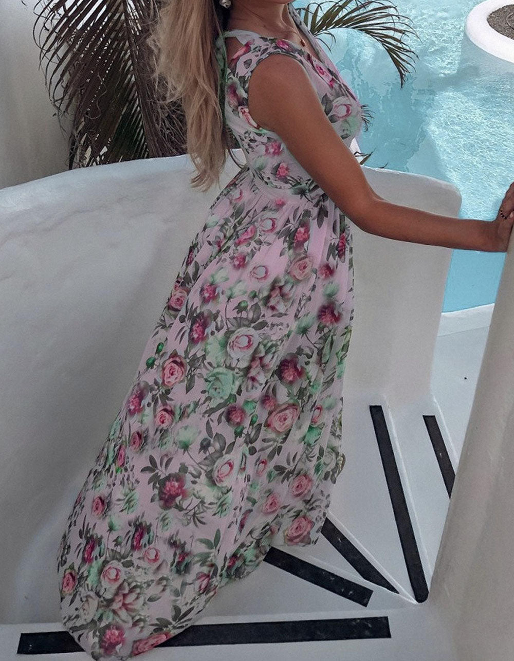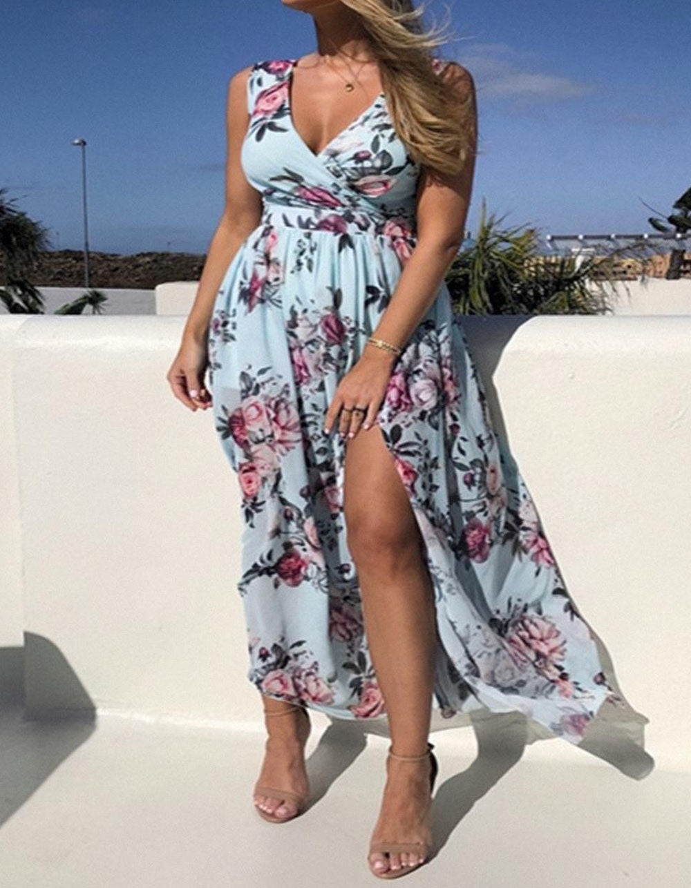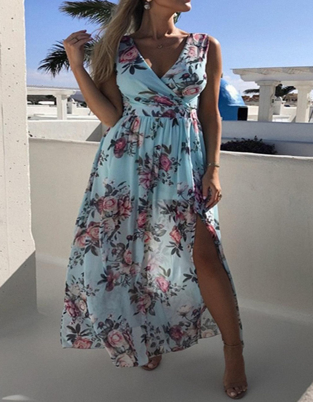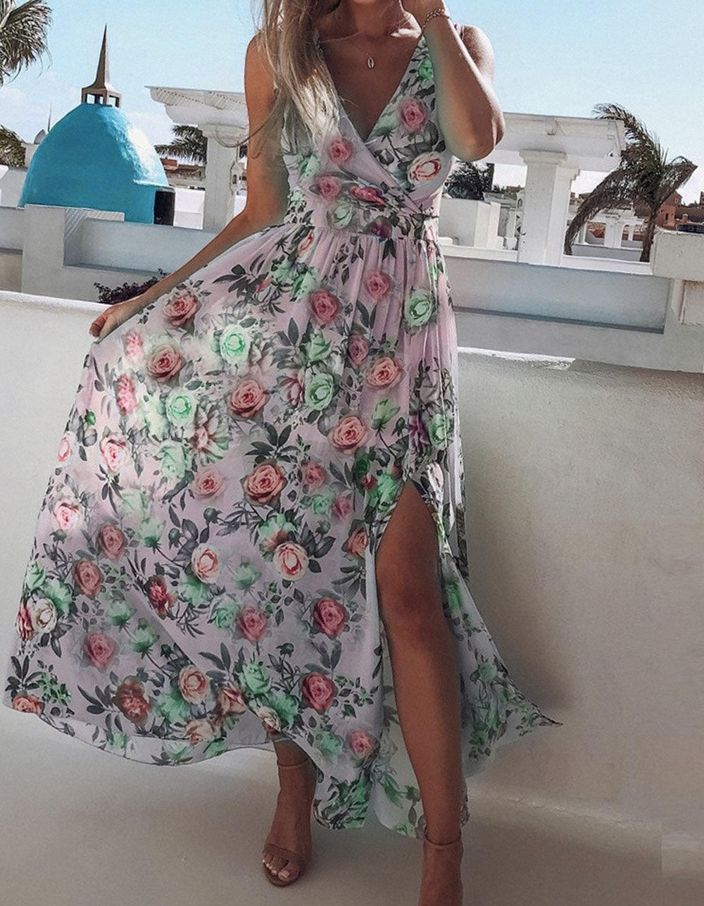 This Floral Printed V Neck Sleeveless Resort Beach Split Chiffon Long Dress is perfect for a day out at the beach or a night in town. Made from high quality Polyester. the midi-length dress features a midi waist. ruffle hem. and A-line fit to flatter any figure. It's available in four different colors: pink. light blue. purple. and yellow.