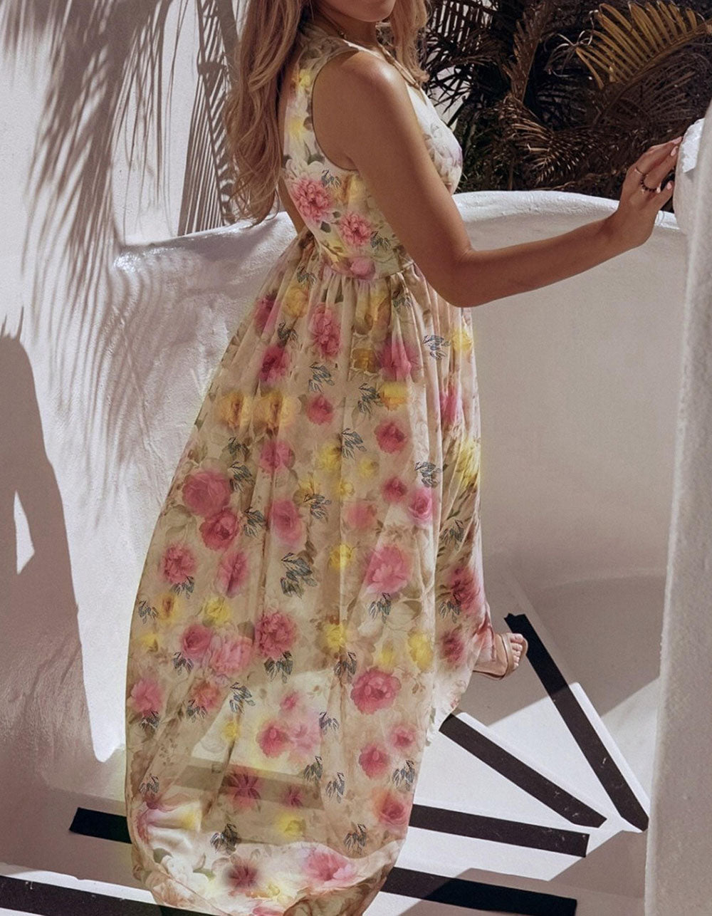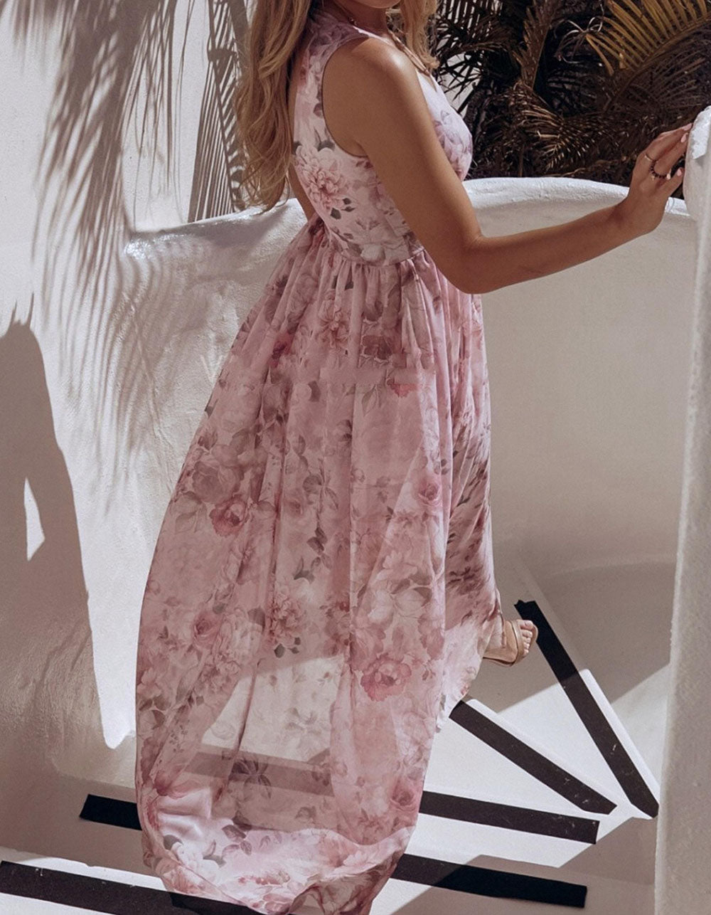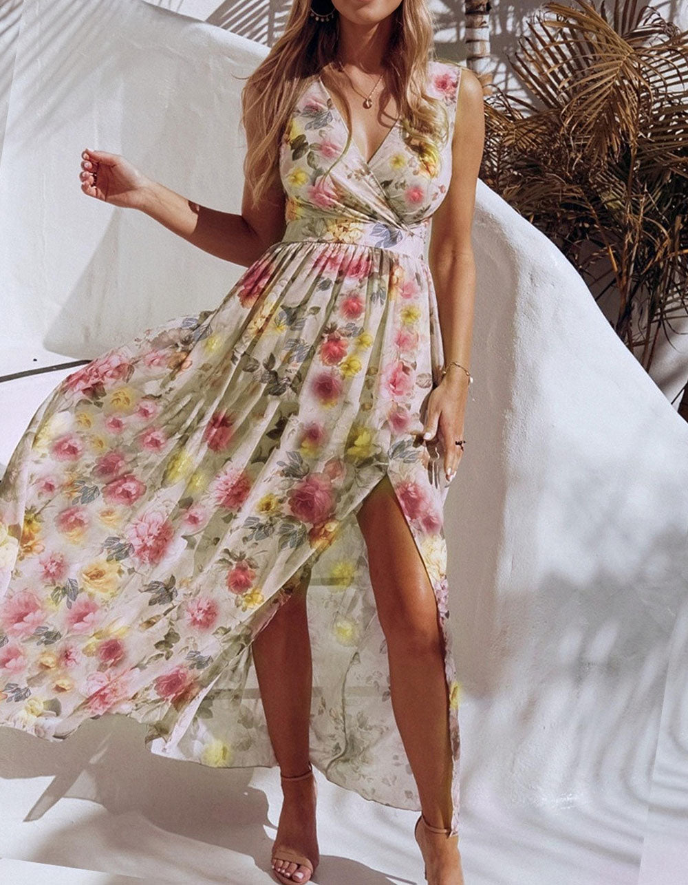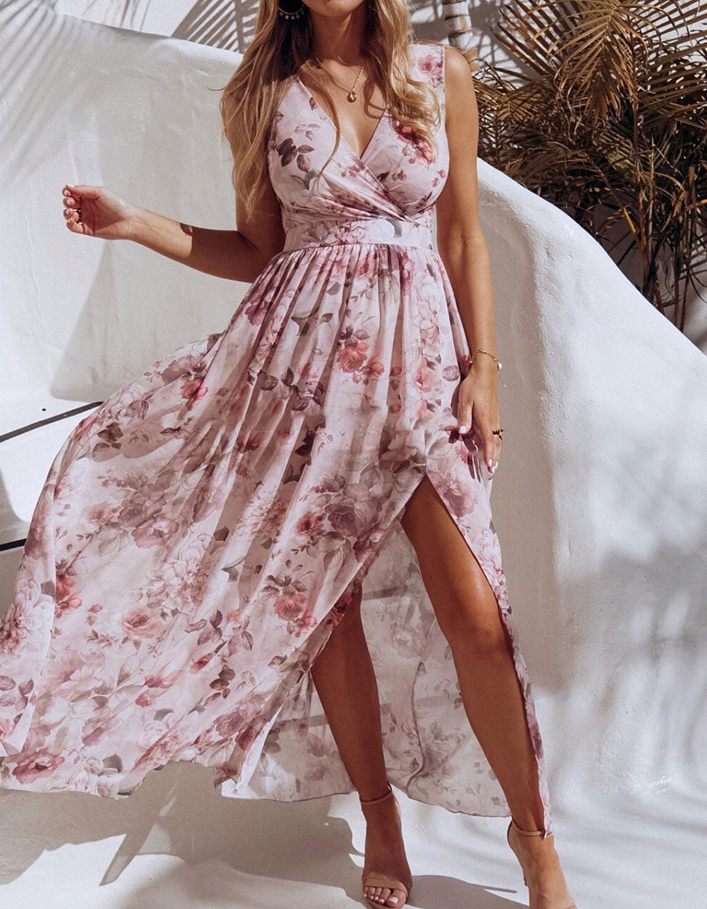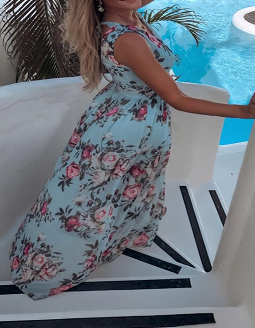 This Floral Printed V Neck Sleeveless Resort Beach Split Chiffon Long Dress is perfect for a day out at the beach or a night in town. Made from high quality Polyester. the midi-length dress features a midi waist. ruffle hem. and A-line fit to flatter any figure. It's available in four different colors: pink. light blue. purple. and yellow.