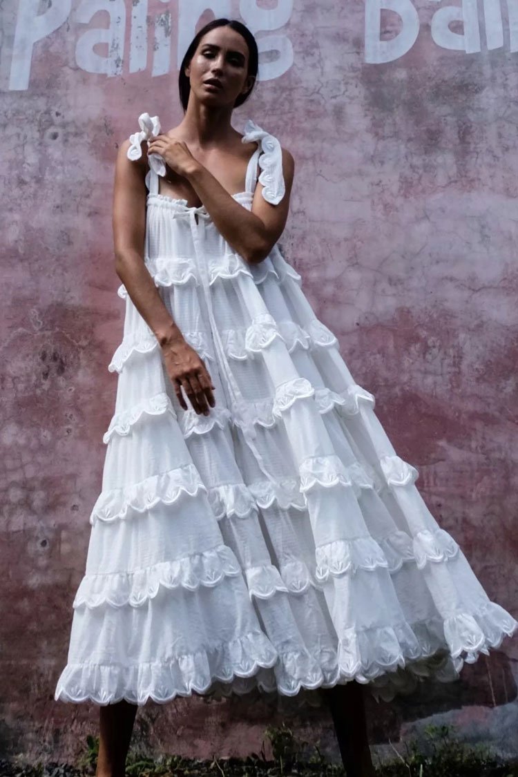 Spring beach dress featuring allover ethnic scalloped lace panel. adjustable self-tie shoulder straps. drawstring strings fastening on chest. tiered adorable trimmed. and flare hemline. good choice for summer holiday.