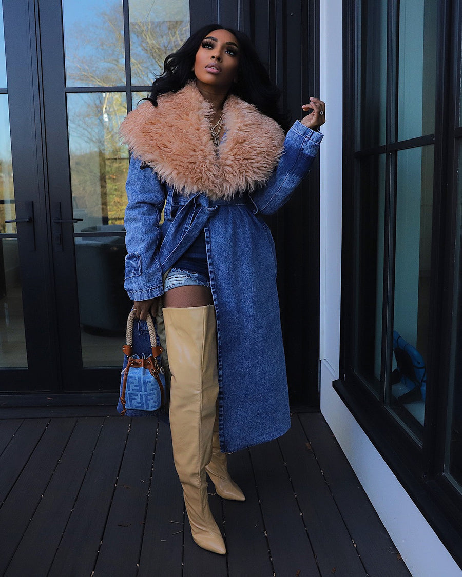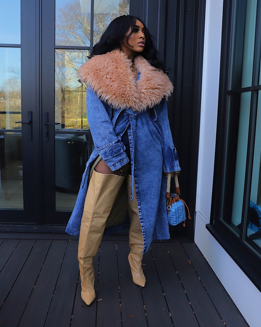 The ultimate winter staple. our Fur Collar Trench Denim Coat will keep you both warm and stylish. A must-have for any fashion-savvy individual. this coat features a luxurious fur collar that adds a touch of elegance to any outfit. Perfect for the colder months. this coat is a definite winter favorite.