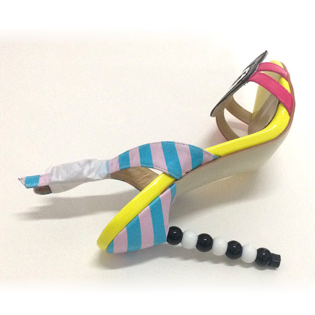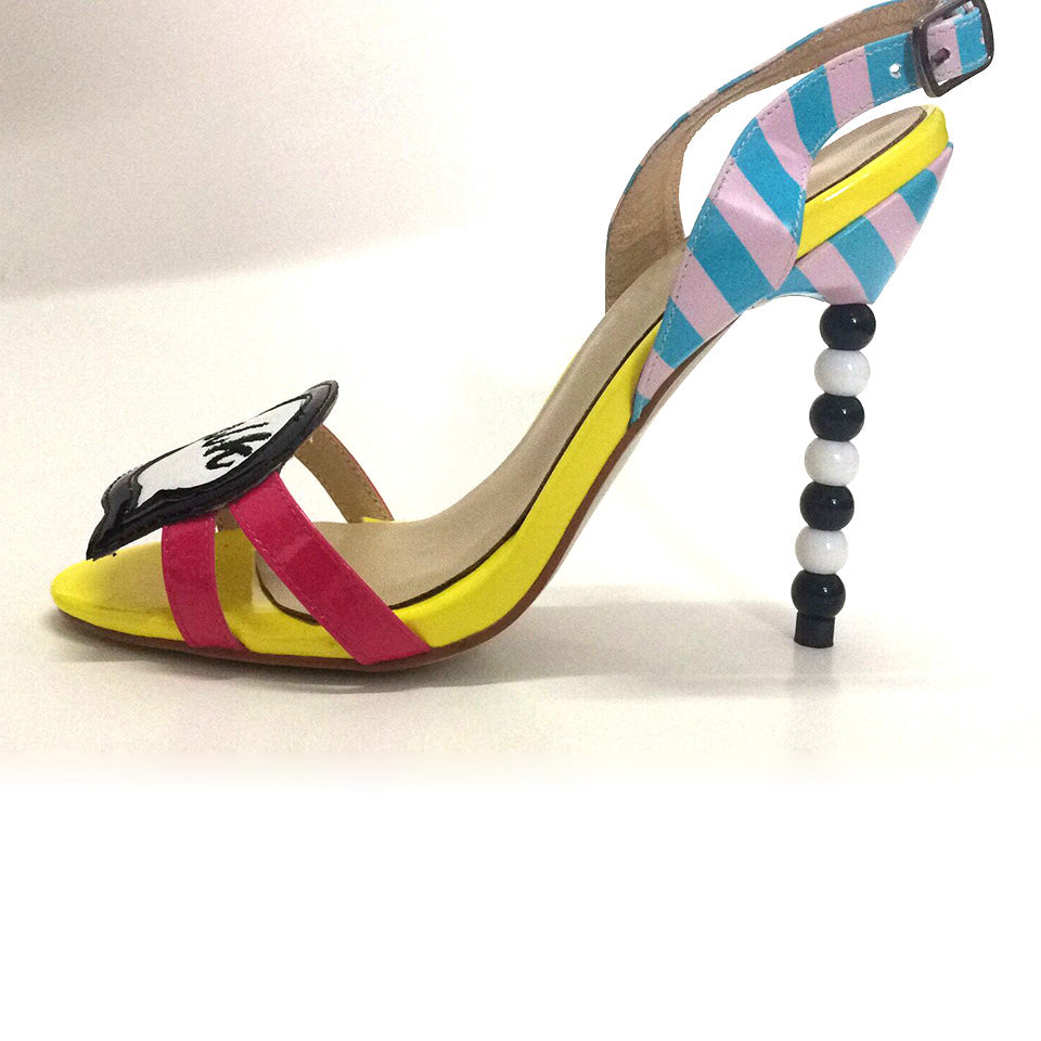Style from the ground up. These Girl Talk Beaded Heels features an multi color open toe design. flat sole. animated "girl talk" on the front. high beaded heel. and an adjustable ankle closure. Simply add these heels to your weekend worthy outfit to complete the look.