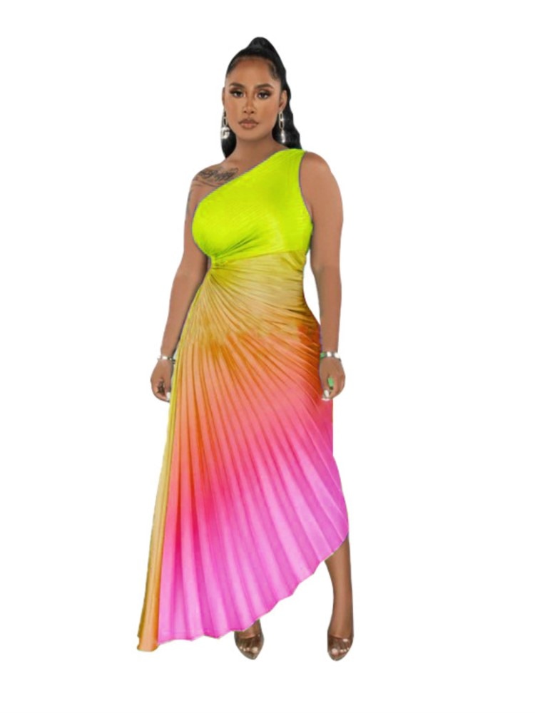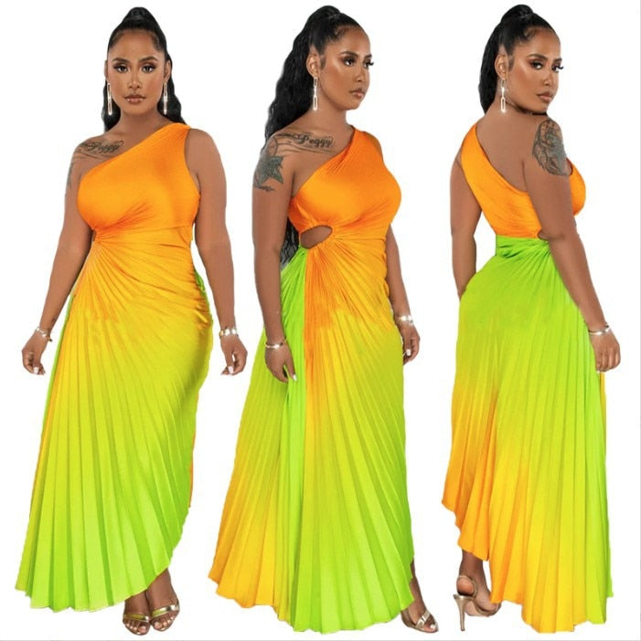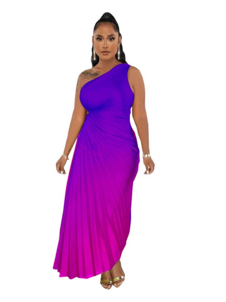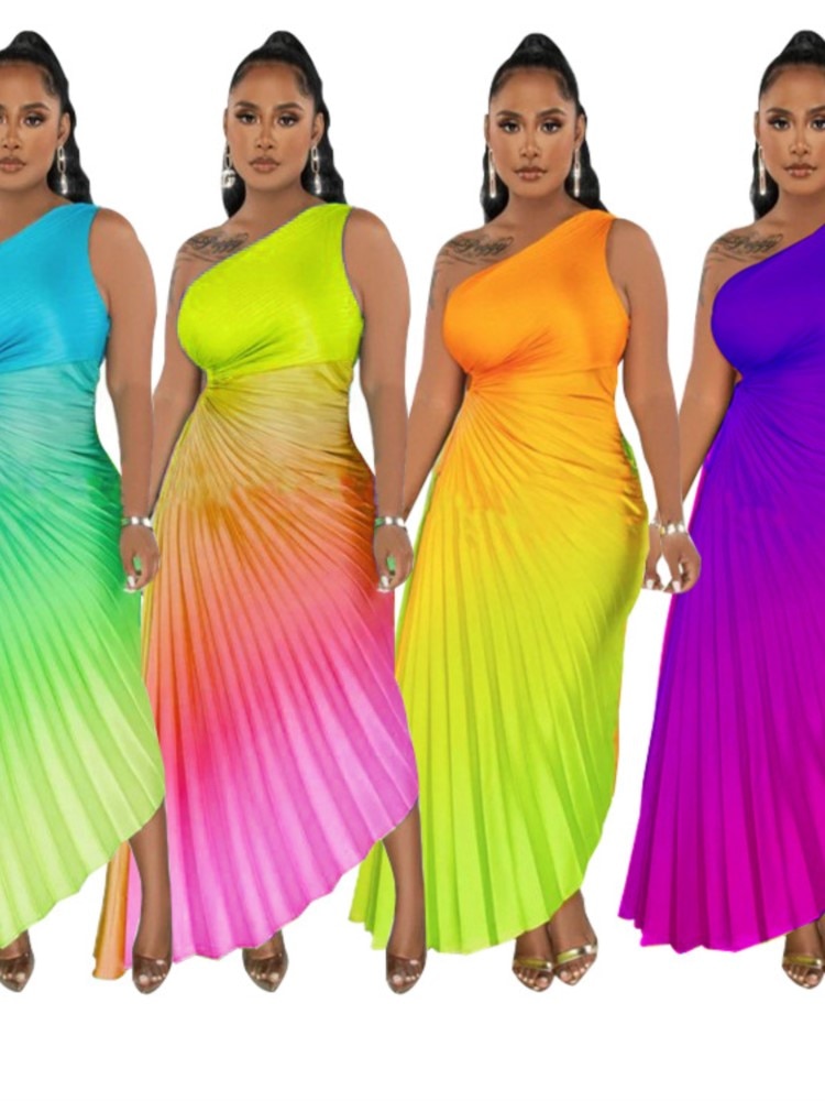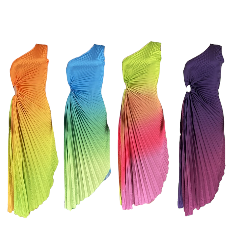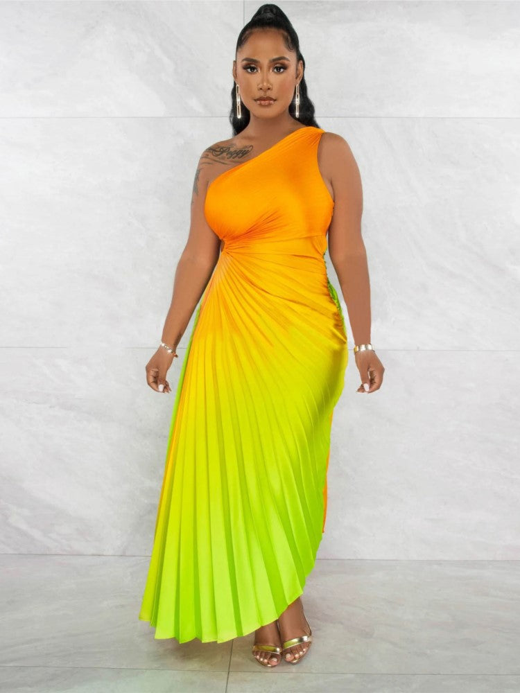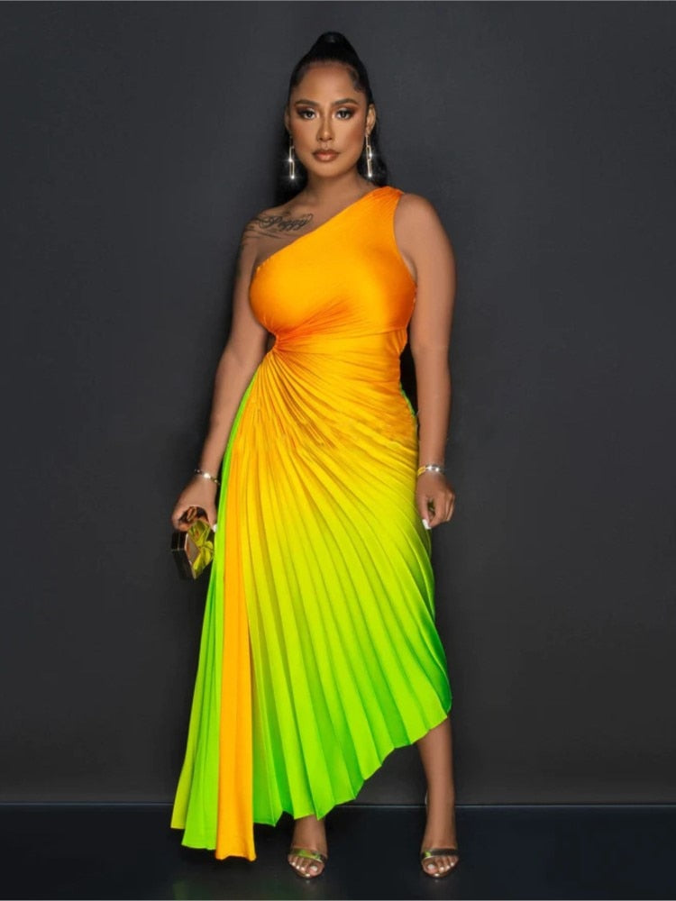 This stylish Gradient Pleated Maxi Dress is the perfect choice for a night out. Crafted from a lightweight pleated fabric. it features a bold ombre pattern with a figure-flattering fit to make for a unique and eye-catching look. With its elegant silhouette and unique design. you'll be sure to stand out.