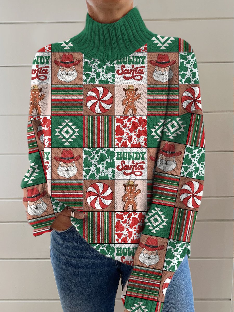 Green Aztec Candy Christmas Art Print Knit Turtleneck Pullover Sweater