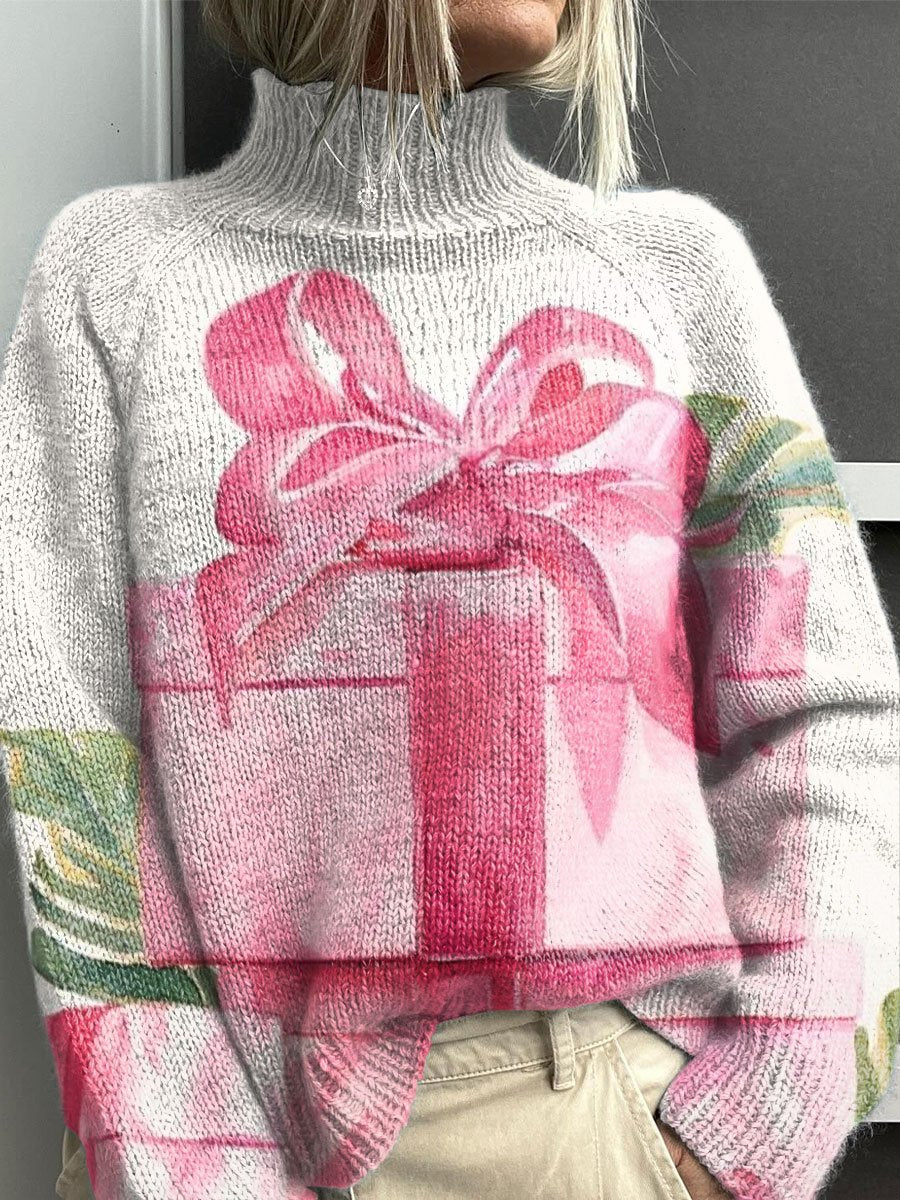 Green Christmas Gift Box Pattern Art Print Knit Turtleneck Pullover Sweater