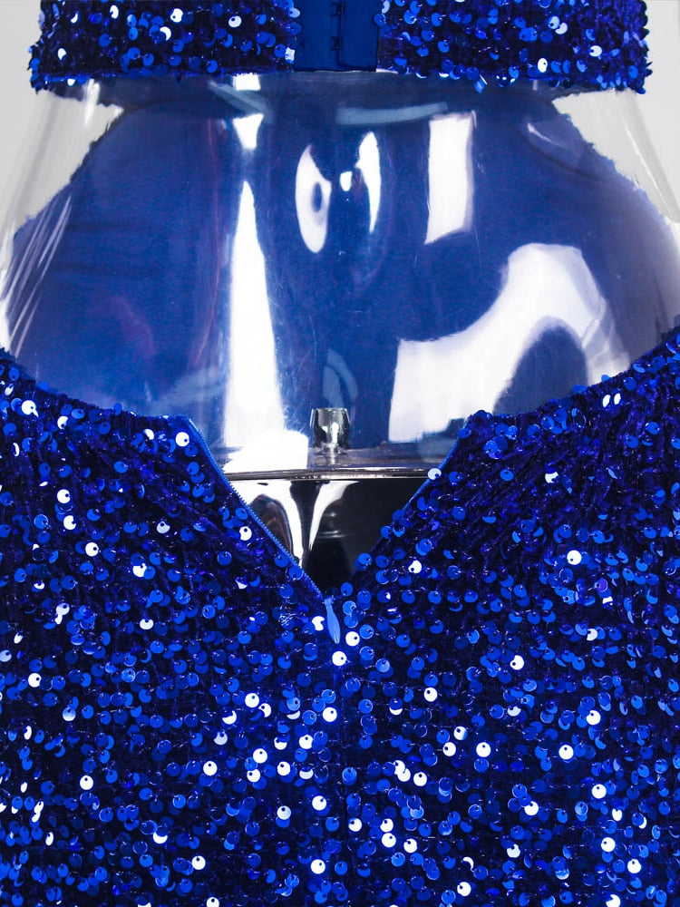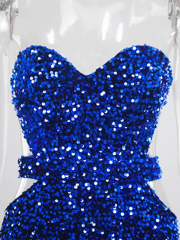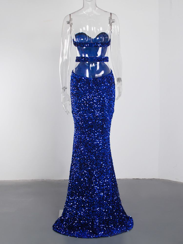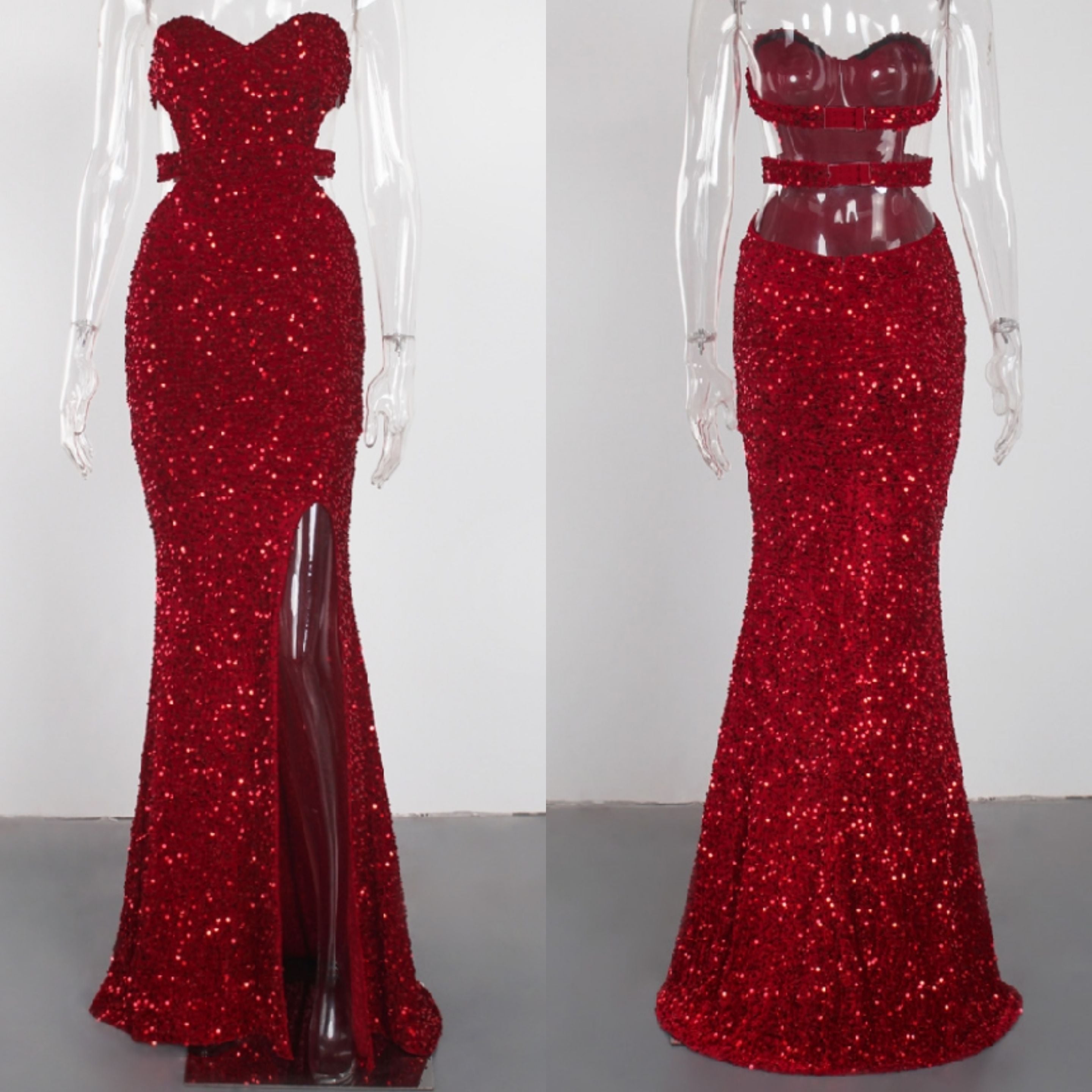 Stretchy FabricRoyal Blue. RedSequin Strapless Floor Length Party Dress Padded/Backless Side Split Evening DressSleeveless