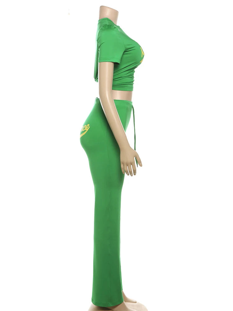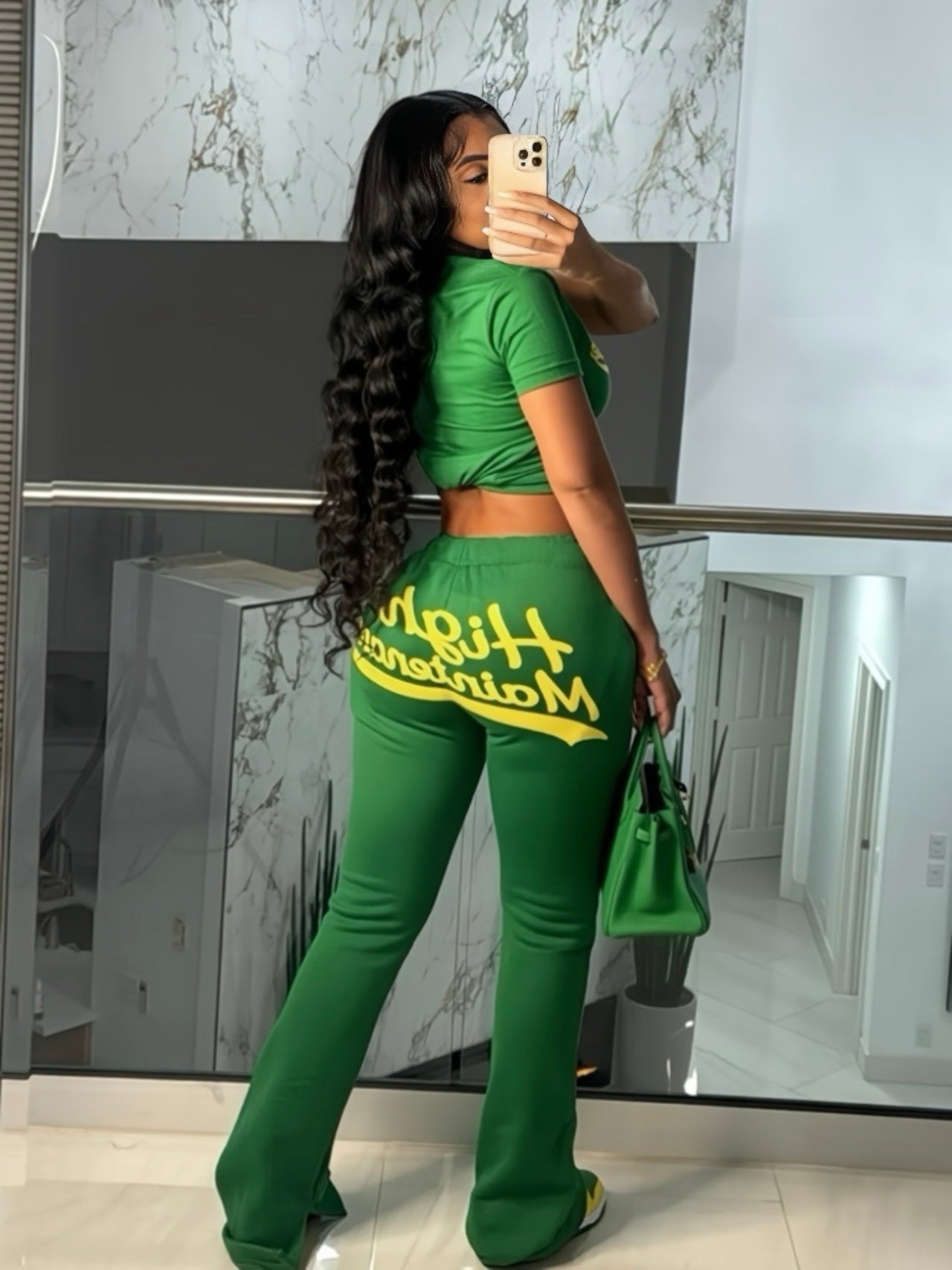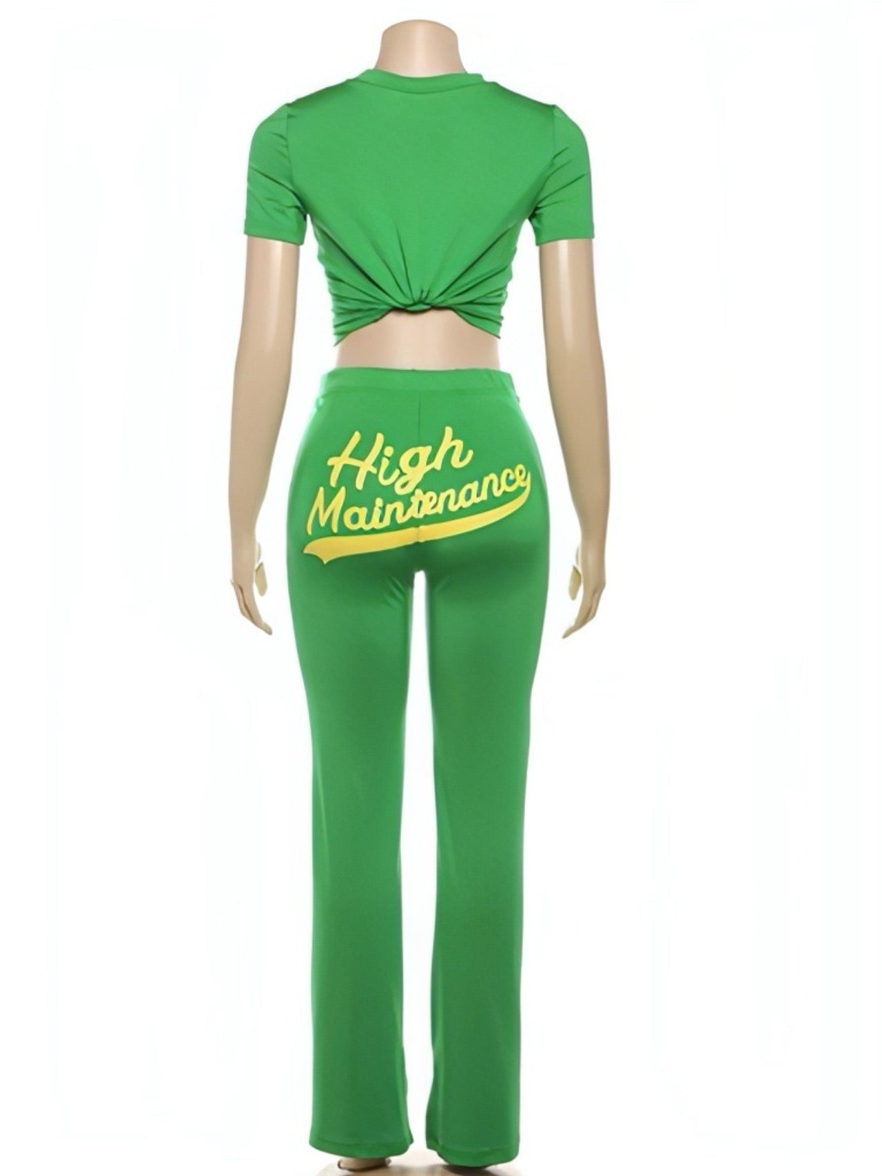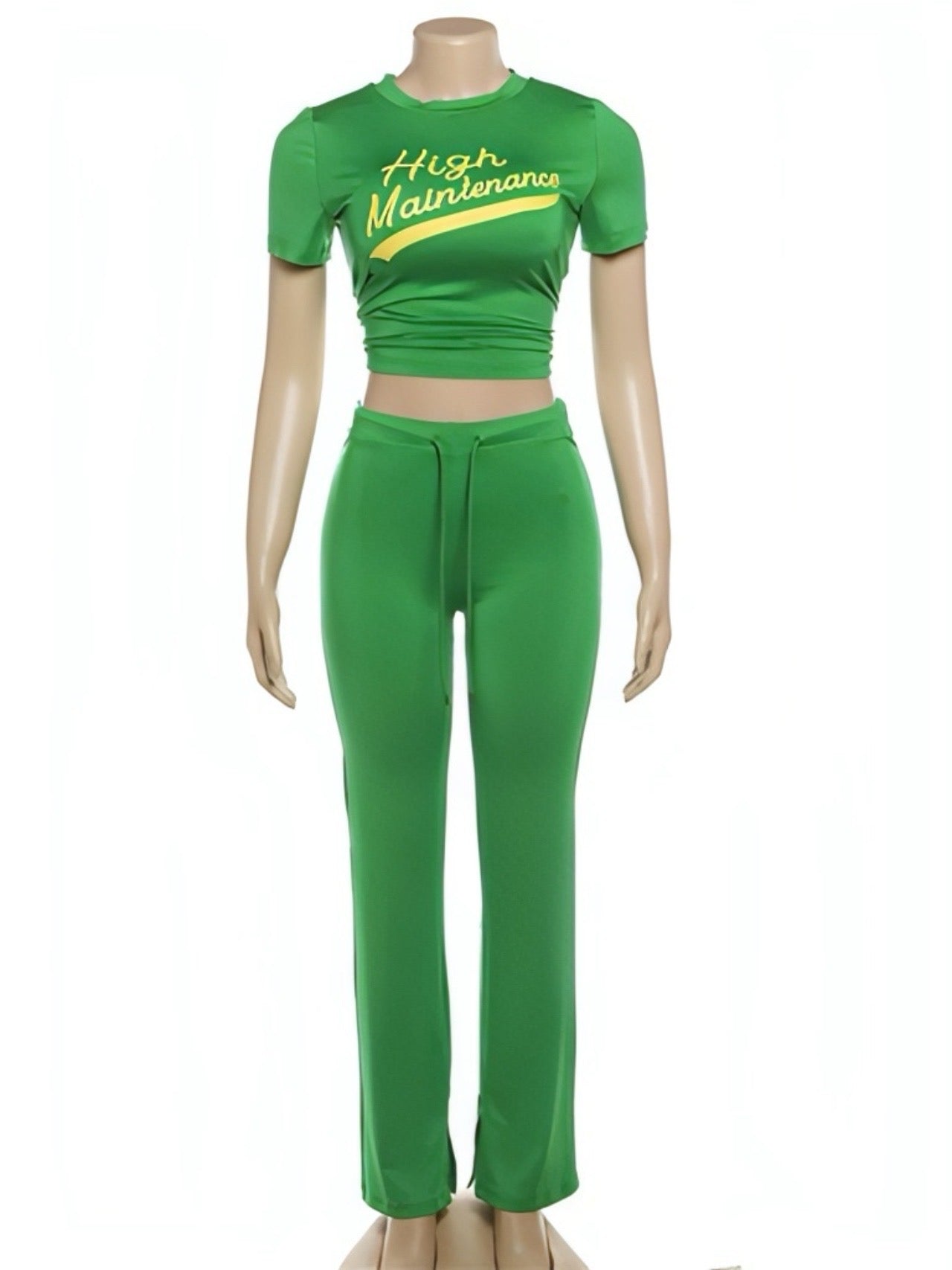 Keep your everyday look bold and bright this season with this High Maintenance Green Two Piece Set. it's a definite yes from us whatever your plans. This two piece set is made using a green soft stretch material with a crop top style. “High Maintenanceâ€?slogan graphic design. and matching straight leg pants. we're obsessed. Just add sneakers and your favorite accessories for a fresh finish.