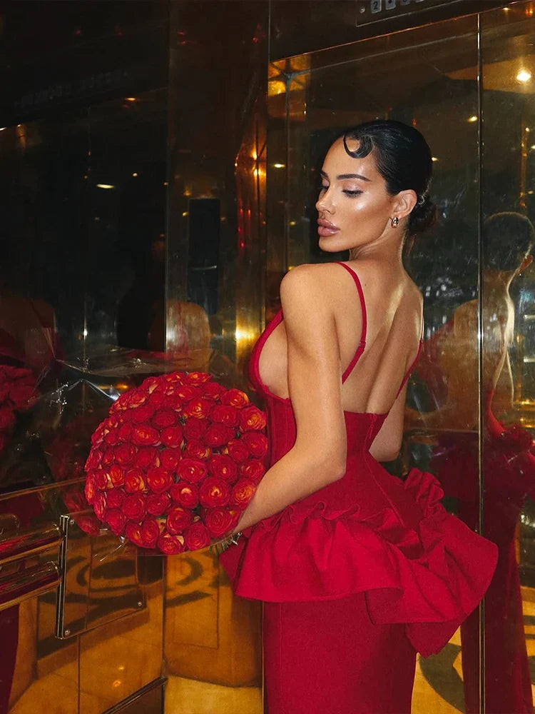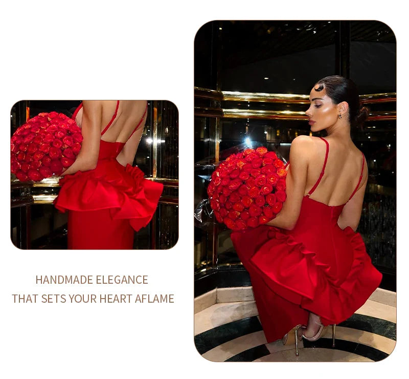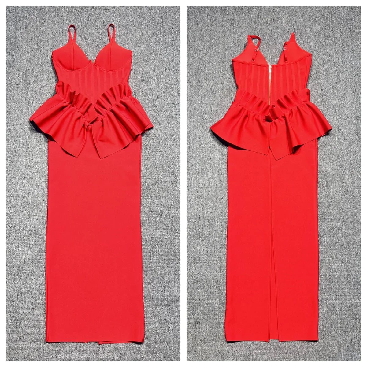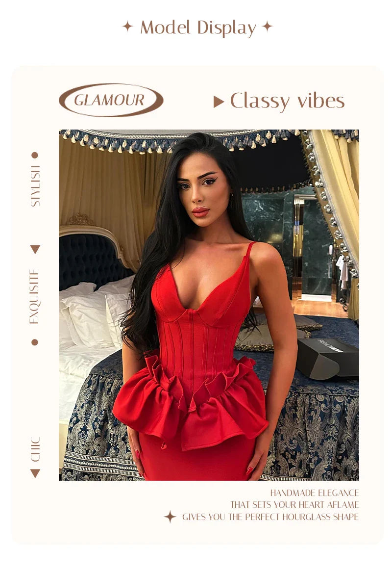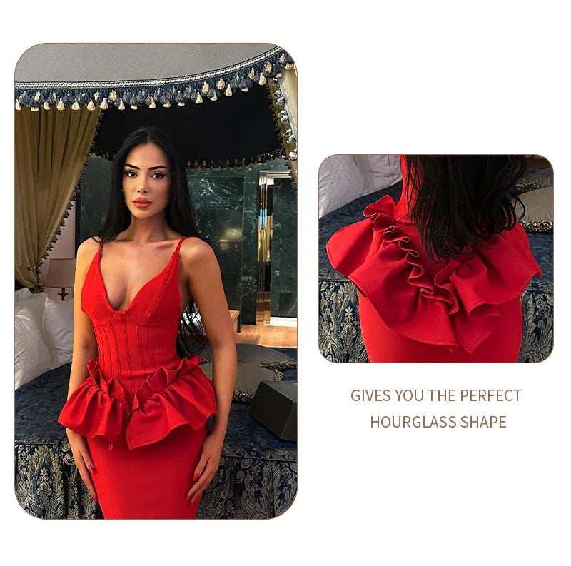 This red corset - style mermaid maxi dress is a showstopper. designed for those who want to stand out. The corset - inspired bodice cinches at the waist. enhancing your curves and providing a flattering silhouette. The peplum detail adds a touch of elegance and drama. while the mermaid - style skirt flows gracefully to the floor. creating a luxurious look.