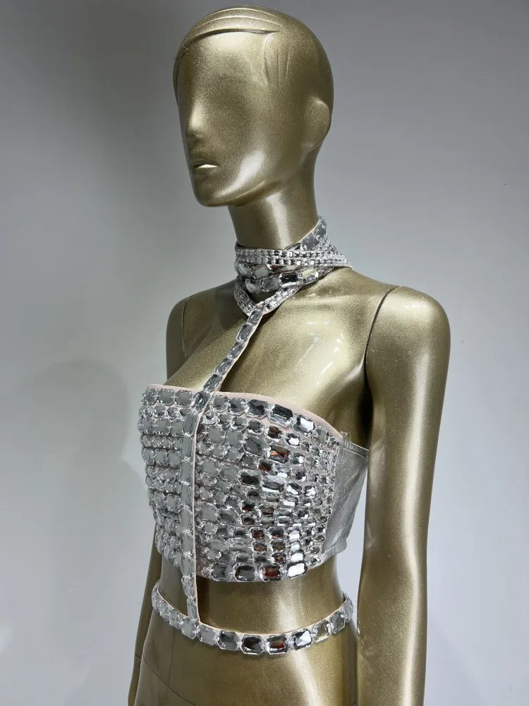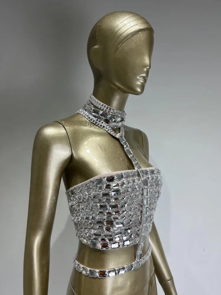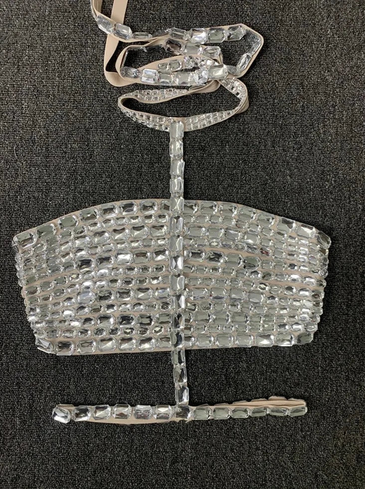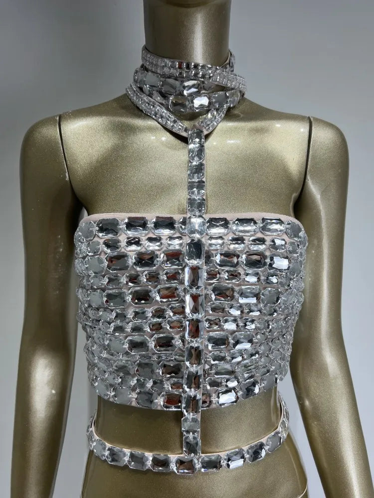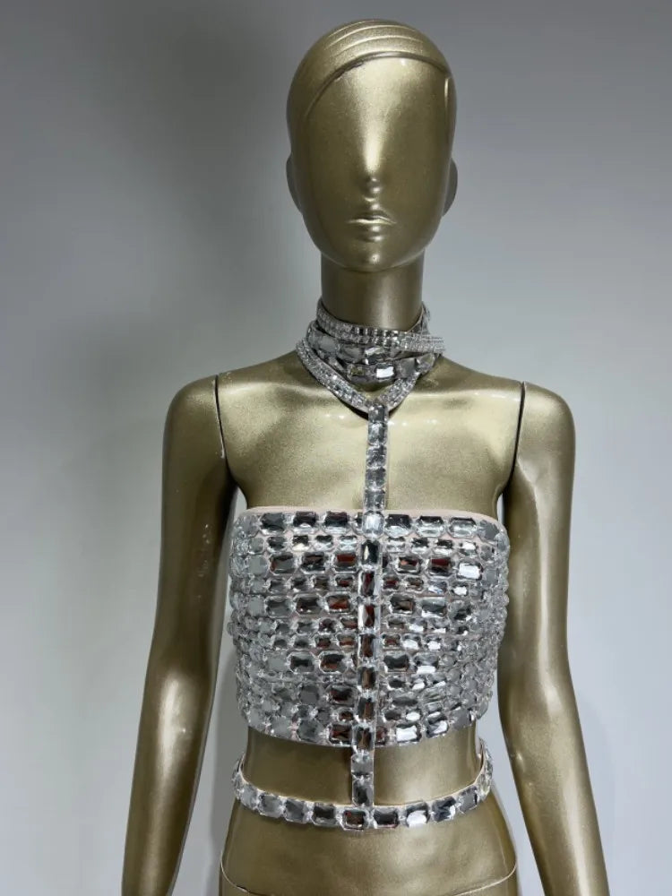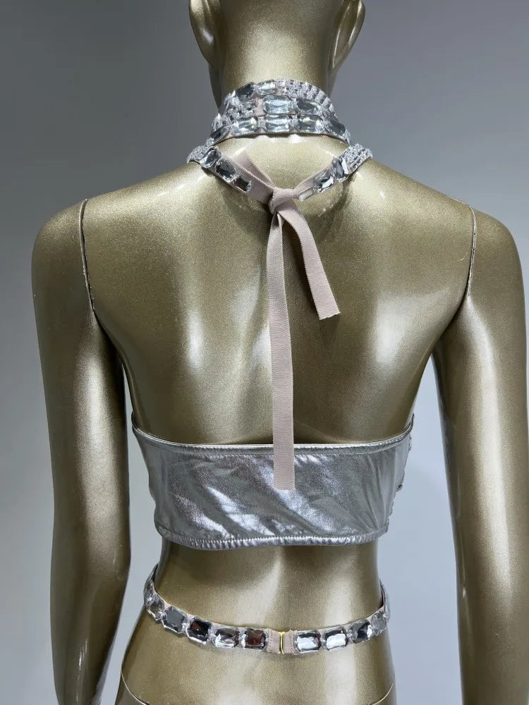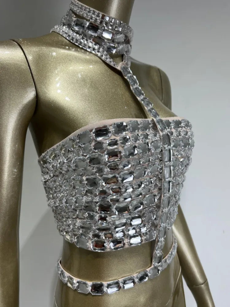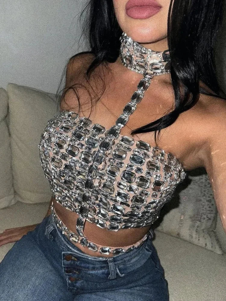 Take your weekend wardrobe to a whole new dimension with this In Your Glow Era Crystal Crop Top. This top is brought to you in a crystal hue with diamante detailing. halter neck style. and a crop top design. how could you turn this down? This top is everything and more we're loving paired with jeans. clear high heels and accessories for a vibe like no other.