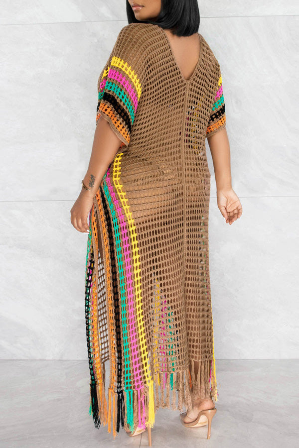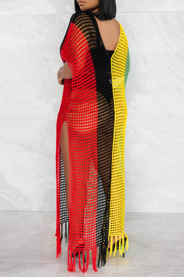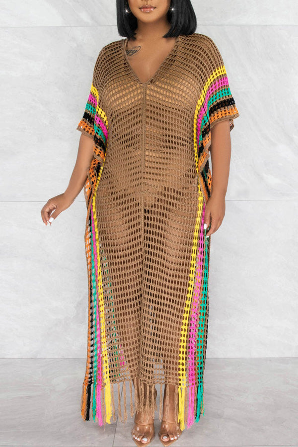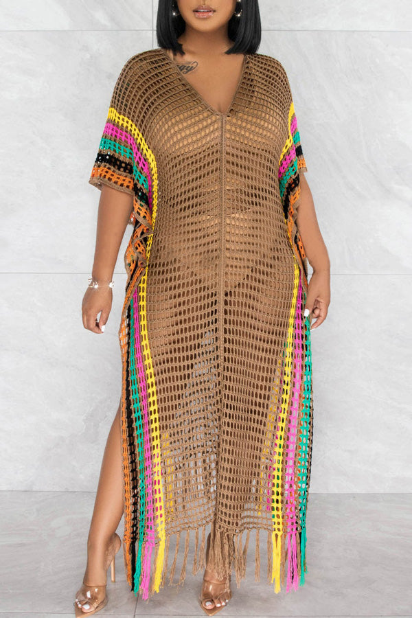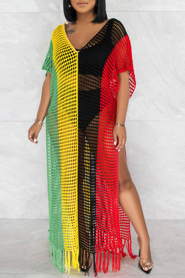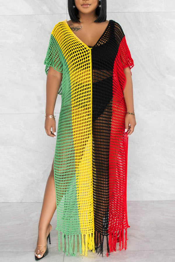 Stay on trend this season in our new beachy. v neck cover up. We especially love the color block fabric and think this piece will be a new favorite in your closet!
