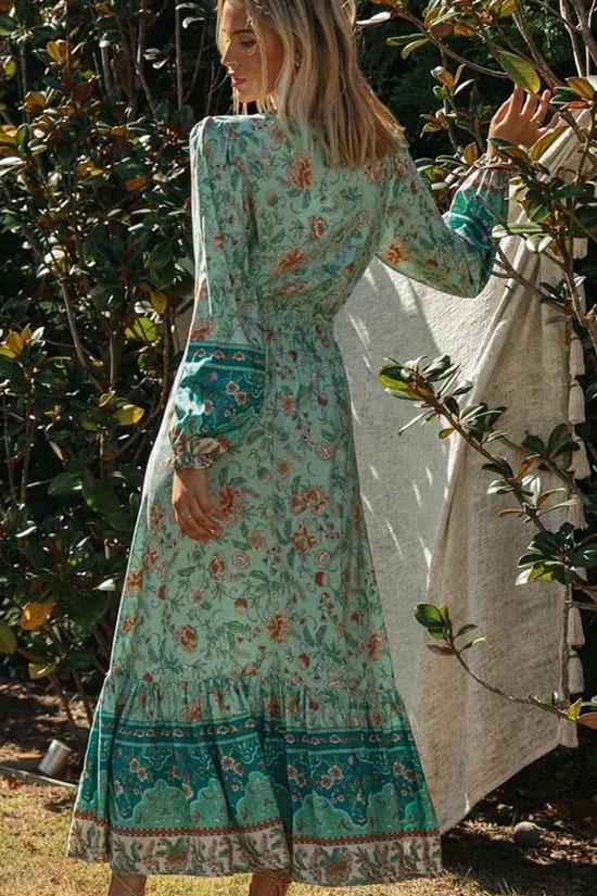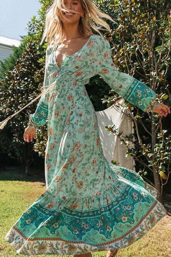 Bohemian style beach dress featuring blend cotton fabric. long sleeves with elastic cuffs. V Neckline with single-breasted trim. drawstring tie with ruched details. flare hemline with stringy-selvedge brim. and maxi length. Choose this patchwork print dress if you plan on lounging around or working from home.