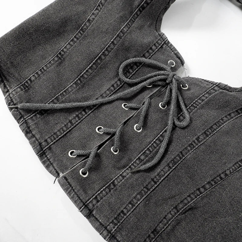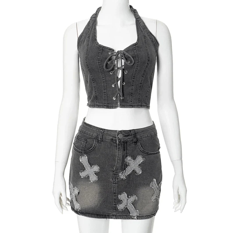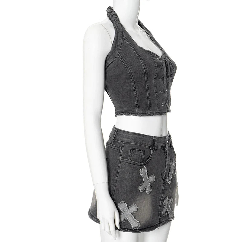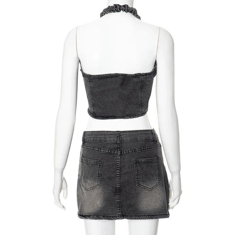 Want to nail all the major trends this season? Then look no further than this Loving Life Denim Two Piece Set. it is the perfect solution to all your styling dilemmas. With a black wash denim material. a laced up halter crop top and a mini skirt to match. how could you say no? Pair this skirt two piece set with knee high heeled boots and simple accessories for a luxe. weekend-ready fit.